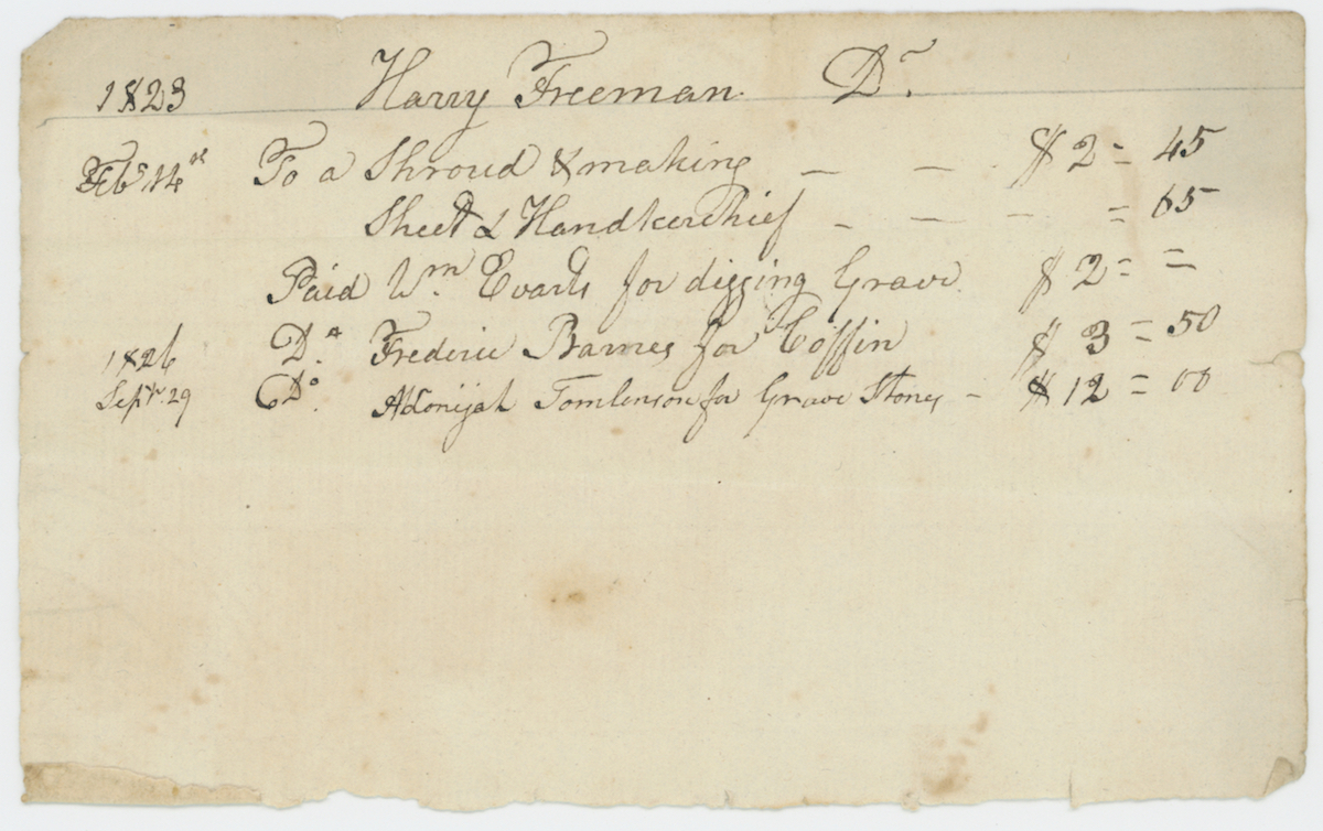 List of burial costs for Harry Freeman, 1823 (Lyme Historical Society Archives at the Florence Griswold Museum)