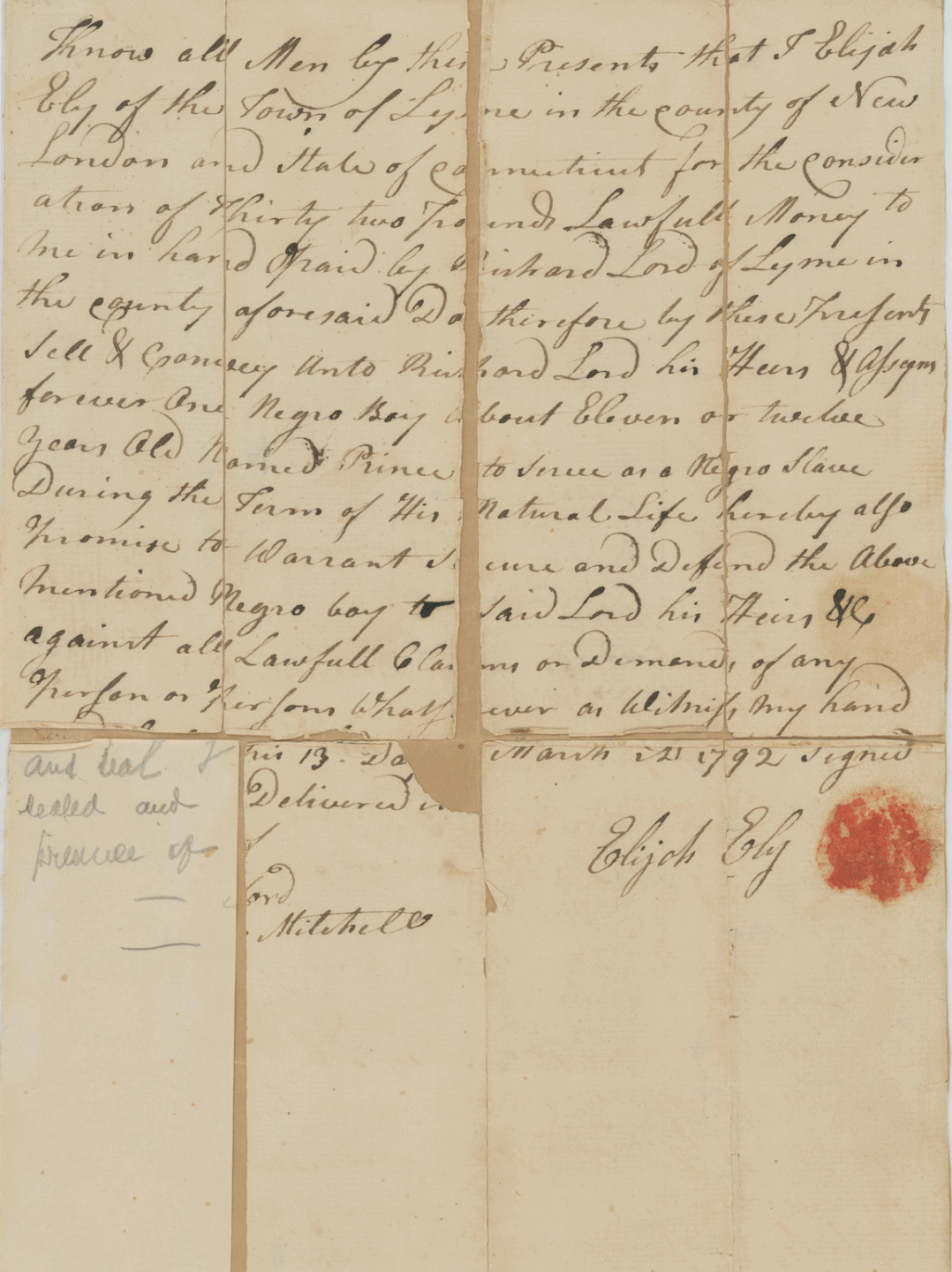 Purchase of Negro Boy Prince, age about 11 or 12, 1792 (Lyme Historical Society Archives at the Florence Griswold Museum)