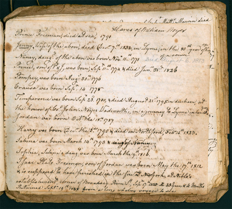 Scrapbook page listing slaves of William Noyes (Lyme Historical Society Archives at the Florence Griswold Museum)