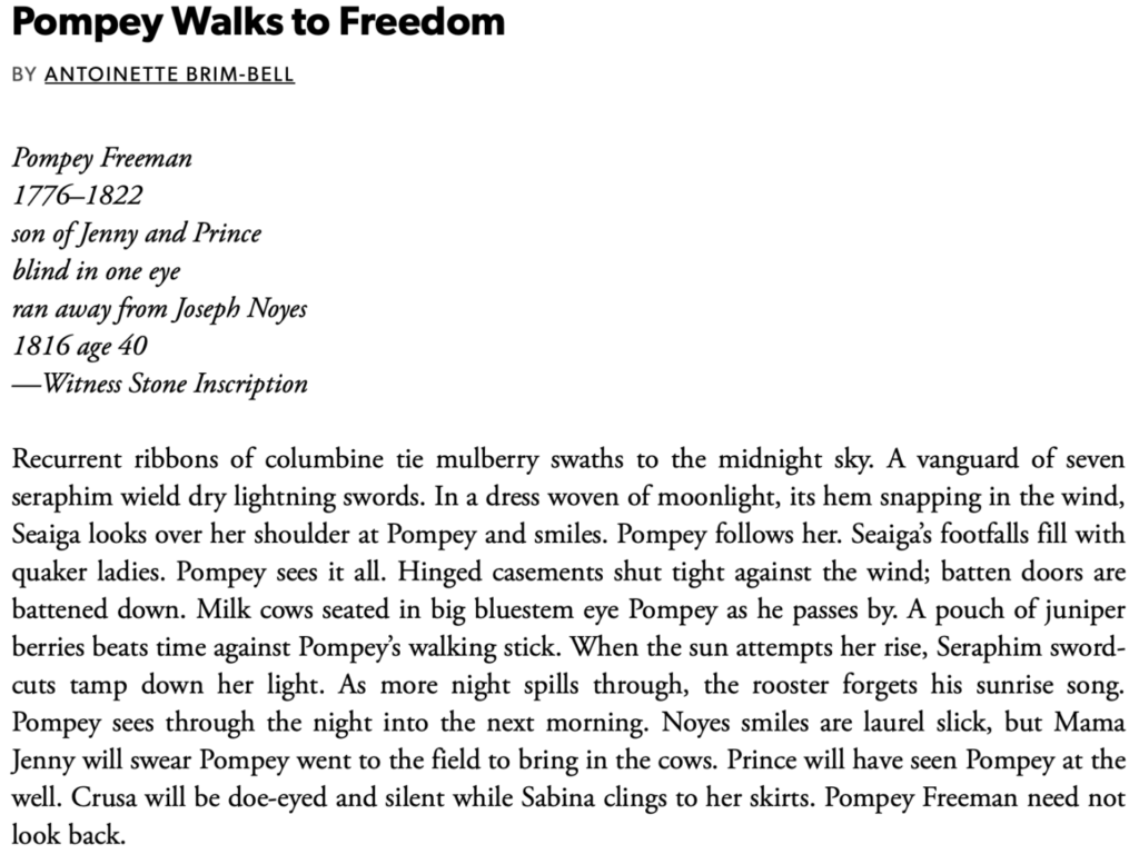 Connecticut Poet Laureate Antionette Brim-Bell, “Pompey Walks to Freedom” (Poetry magazine, November 2021, p. 156)