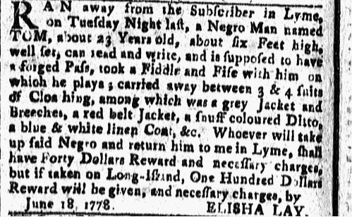 Connecticut Gazette advertisement (June 18, 1778) for Tom, age about 23, who could read and write, play a fiddle and fife, and ran away from Elisha Lay (1747–1839) in Lyme.