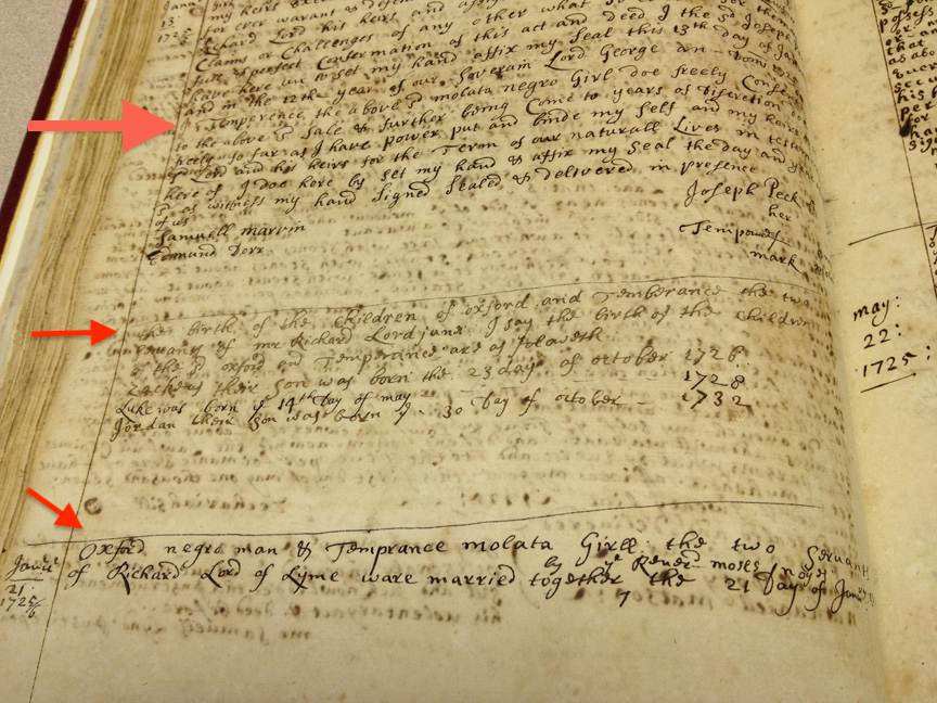 Purchase of Temperance; births of Temperance and Oxford’s children; marriage of Temperance and Oxford (Lyme Land Records 4:170)