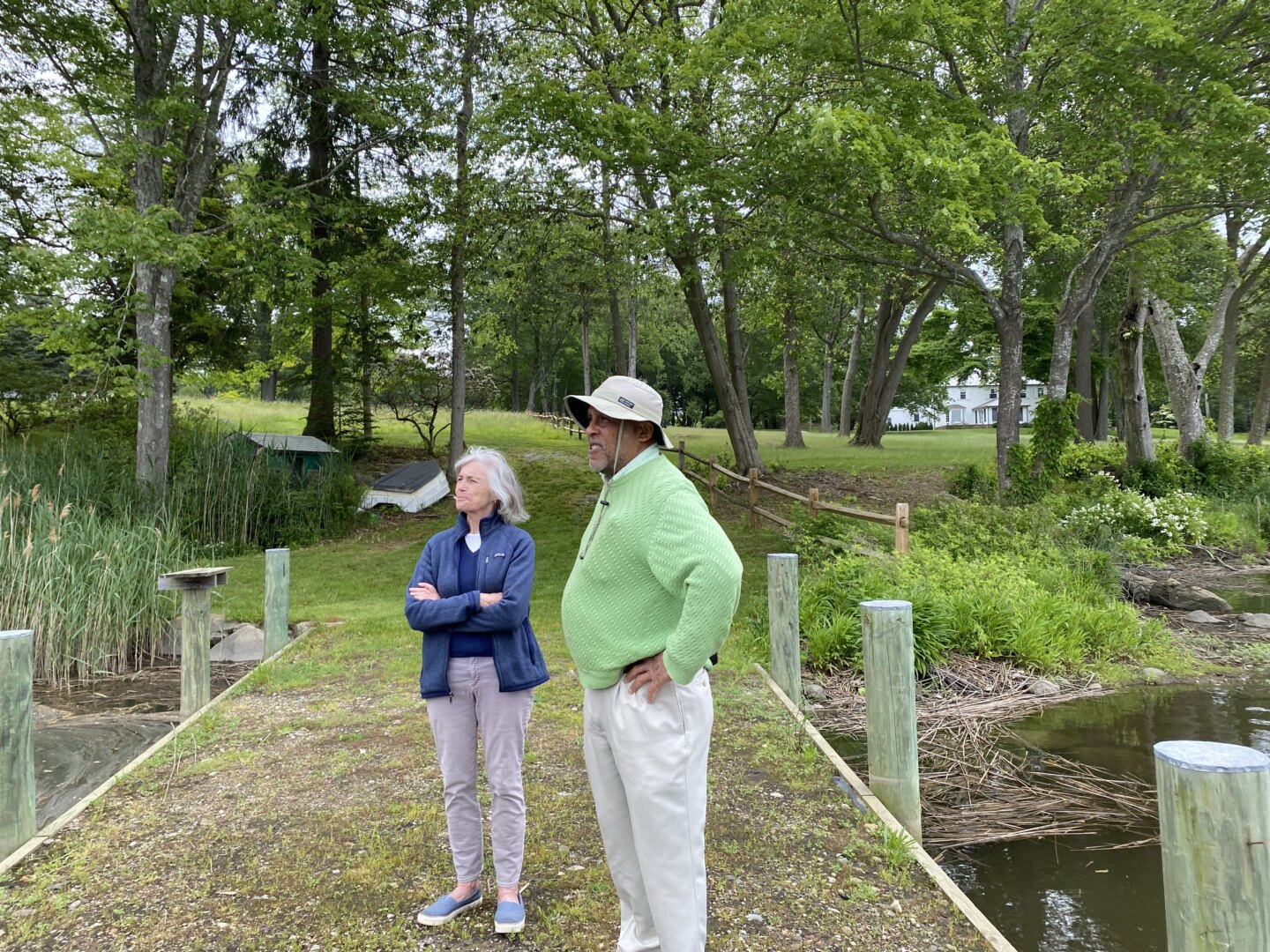 William Earle Williams and Carolyn Wakeman view the approximate site of the Noyes family’s landing place on the Lieutenant River, 2023. Courtesy Jennifer Parsons.