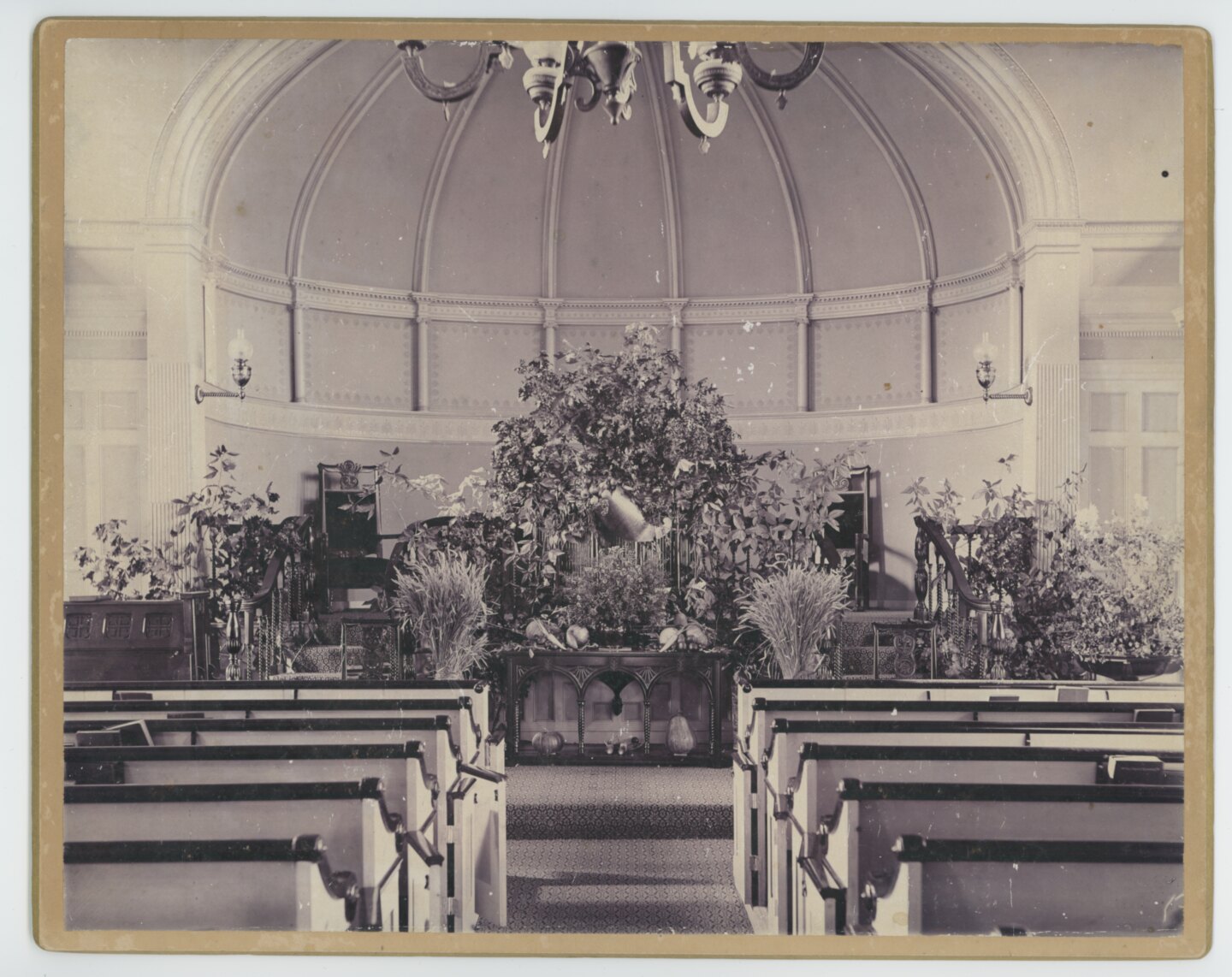 Old Lyme Church interior decorated for the harvest season, ca. 1889. LHSA