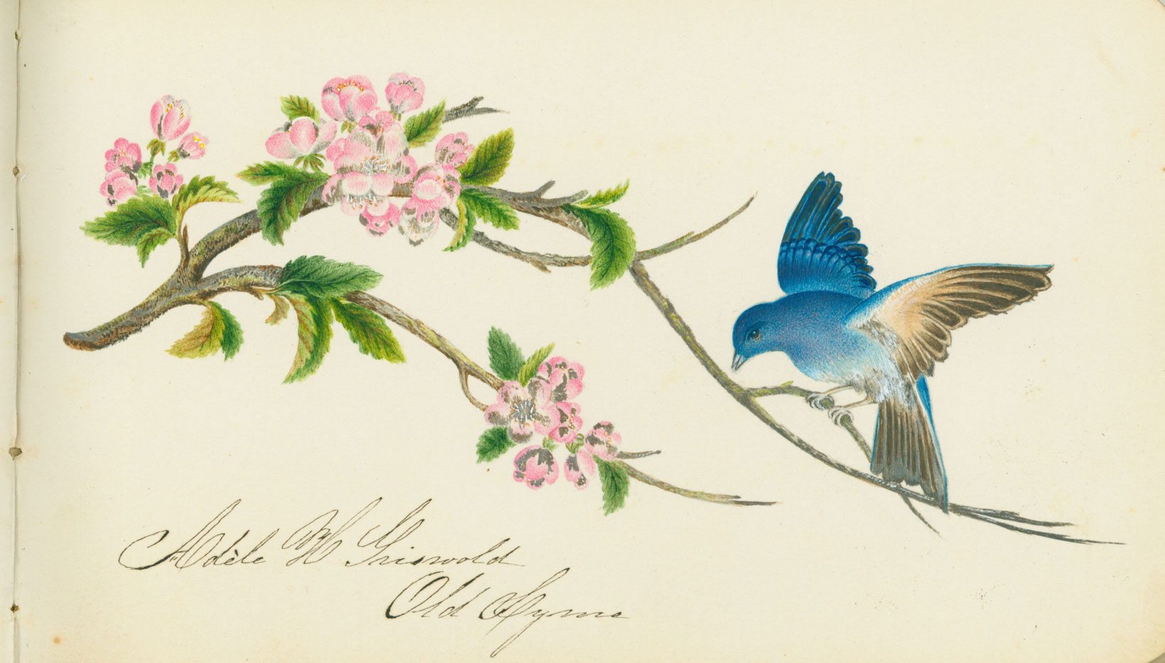 Adele Griswold, bluebird with cherry blossoms, watercolor sketch, autograph book, 1878. LHSA