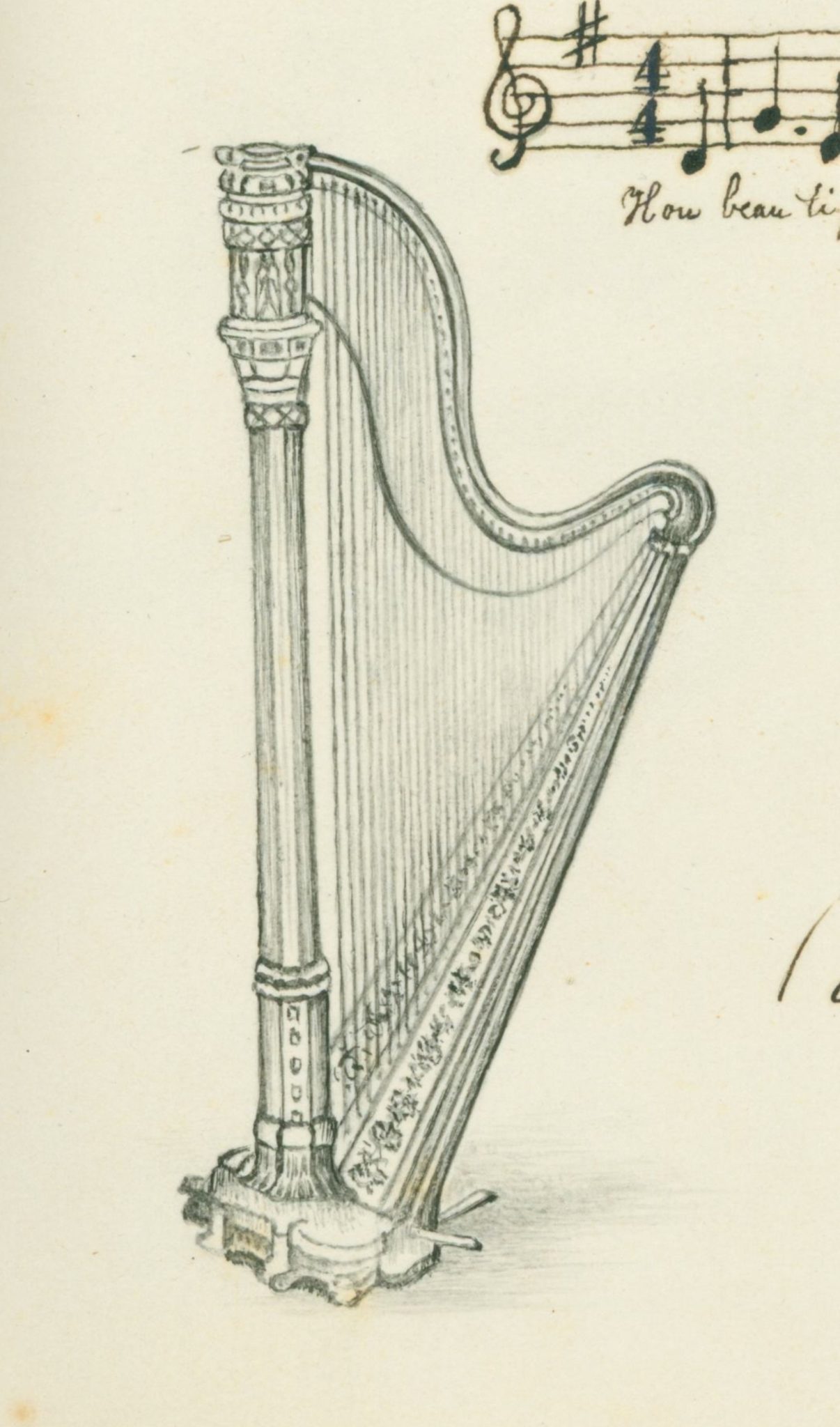 Feature Photo (above): Florence Griswold, family harp, pen and ink sketch, autograph book, 1878. Lyme Historical Society Archives