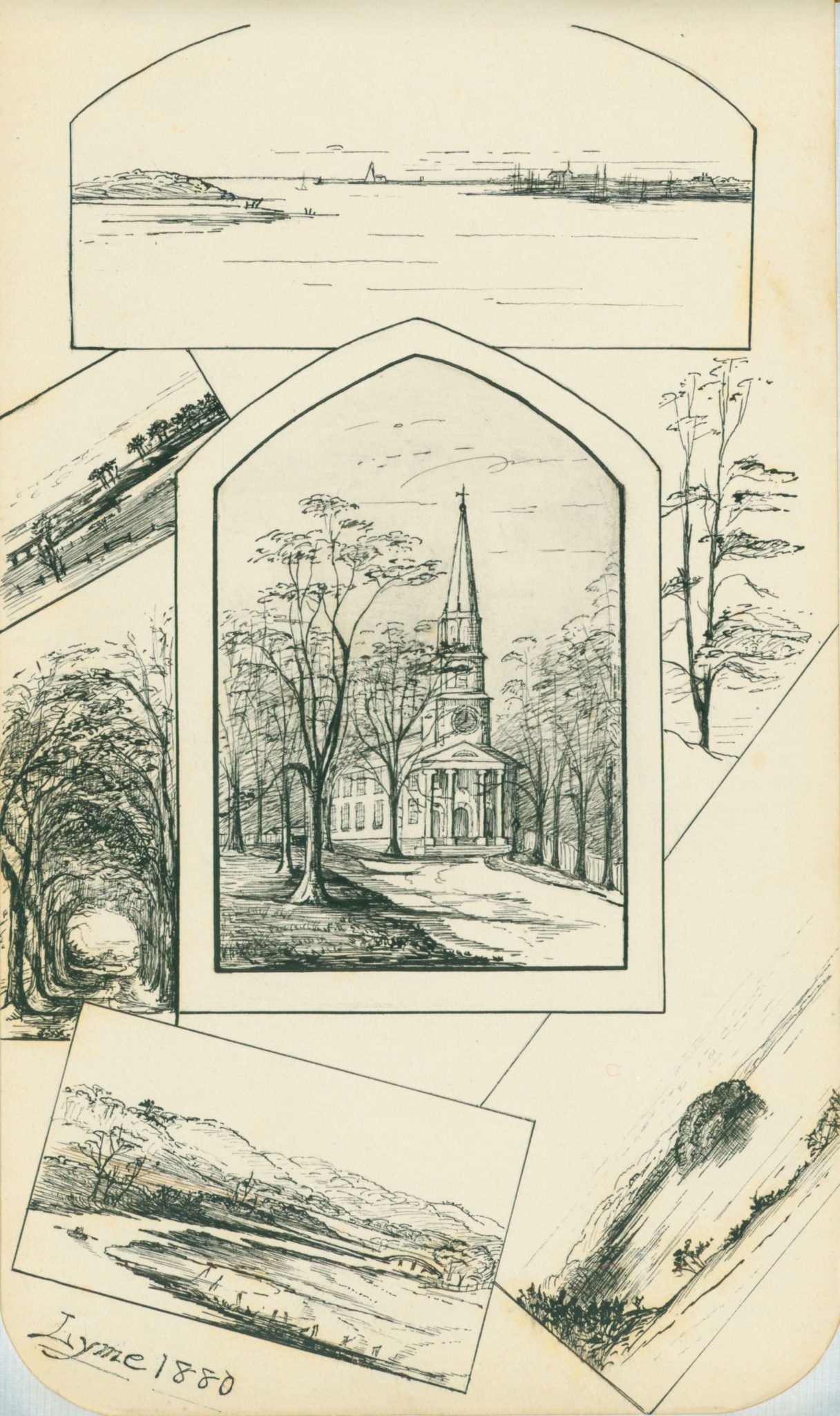 More than half of Rev. Cary’s autograph pages remain blank, but towards the end an unknown artist contributed in 1880 a cluster of drawings that capture Old Lyme’s renowned church and other scenic local settings. Like the entries from the Griswold sisters, those graceful sketches remind us that the town had become “a place for art” even before the country’s most celebrated landscape painters gathered at Miss Florence’s home in 1900 and established the Lyme Art Colony.