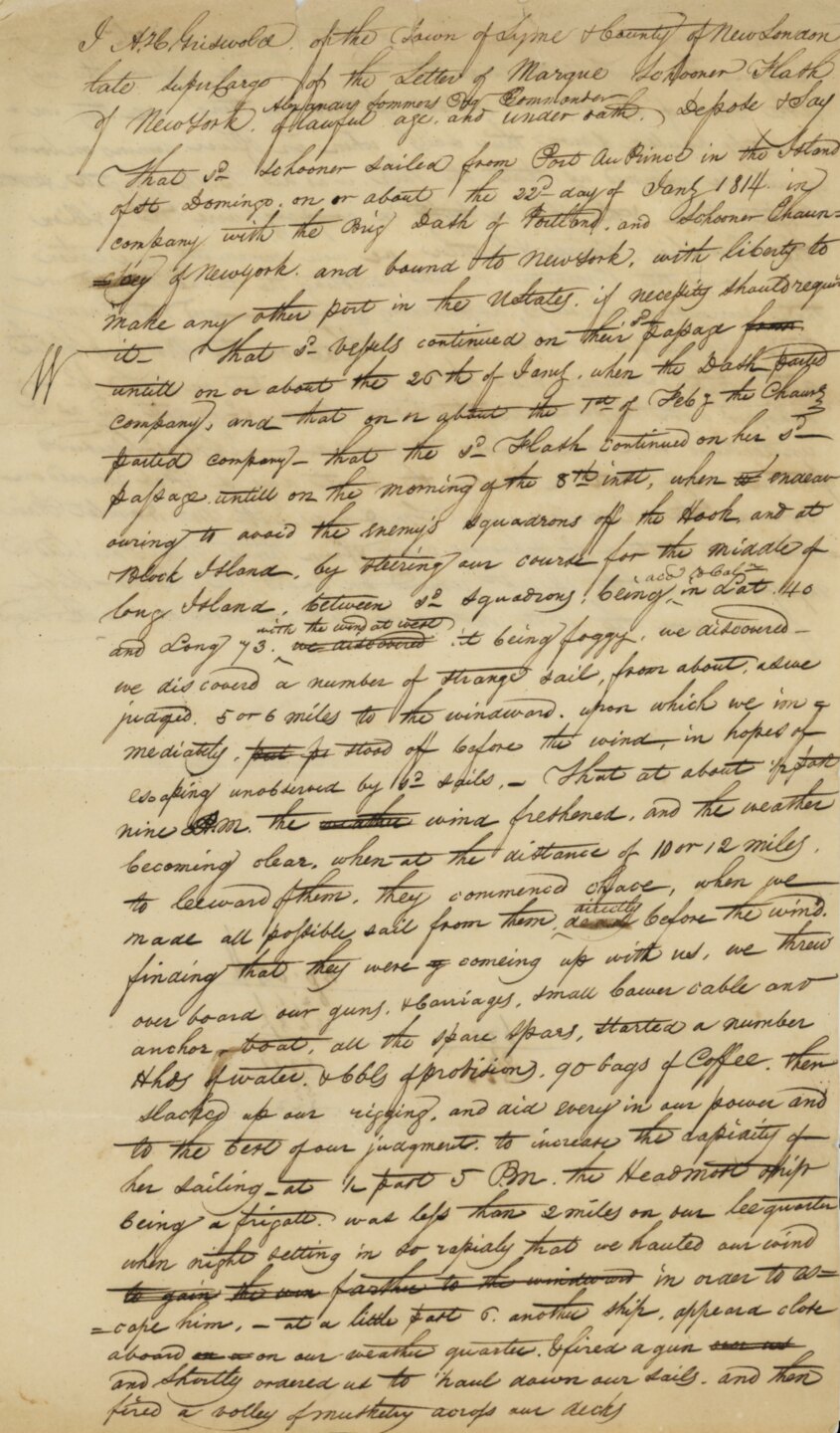 I, A.H Griswold of the Town of Lyme & County of New London late SuperCargo of the Letter of Marque Schooner Flash of NewYork, Alexander Sommers Esq Commander, of lawful age, who under oath, depose & say