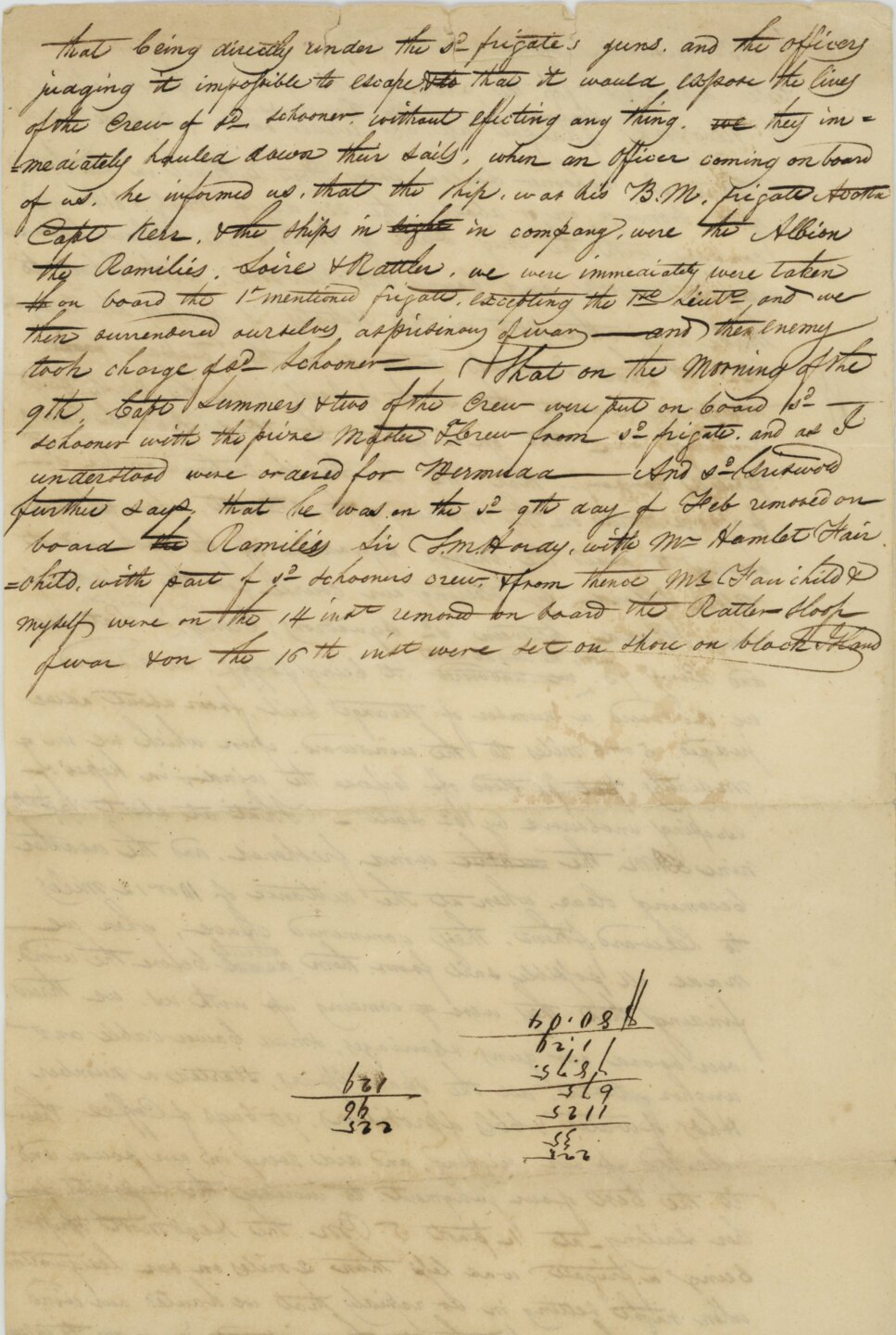 that being directly under the sd frigate’s guns, and the officers judging it impossible to escape & that it would expose the lives of the crew of sd schooner, without effecting any thing, they immediately hauled down their sails, when an officer coming on board of us, he informed us, that the ship, was his B.M. frigate Acasta Capt Kerr, & the ships in in company, were the Albion the Ramilies, Loire & Rattler, we were immediately were taken on board the 1st mentioned frigate, excepting the 1st Lieutn, and we then surrendered ourselves as prisoners of war – and the enemy took charge of sd Schooner – That on the morning of the 9th Capt Summers & two of the crew were put on board sd schooner with the prize master & a Crew from sd frigate, and as I understood were ordered for Bermuda – And sd Griswold further says that he was on the sd 9th day of Feb removed on board the Ramilies Sir T.M. Hardy, with Mr Hamlet Fairchild with part of sd schooners crew & from thence Mr Fairchild & myself were on the 14 inst removed on board the Rattler Sloop of war & on the 16th were set on shore on block Island.