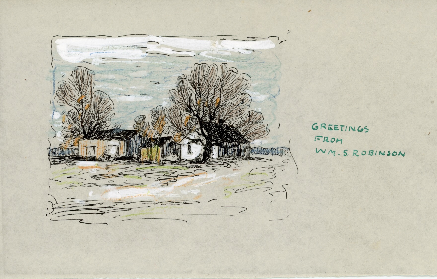 William S. Robinson, Greetings from Wm. S. Robinson, n.d. Ink, graphite, colored pencil. Jack Hoffman Papers, Lyme Historical Society Archives, Florence Griswold Museum
