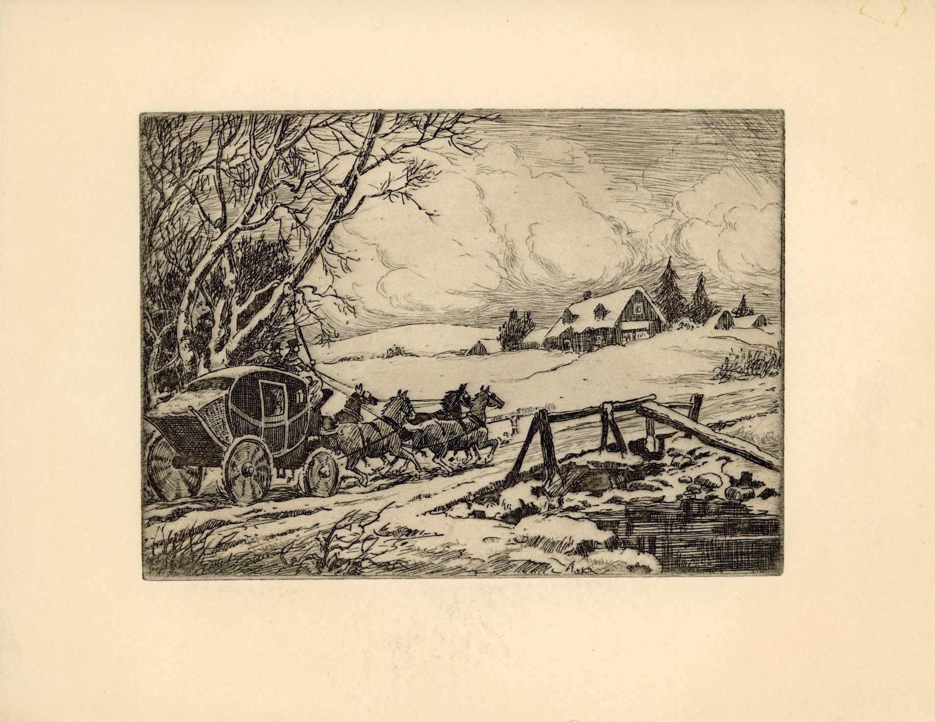Even etchings that include imagined details capture the features of the local landscape. One year Pauline and William Chadwick sent an etching of wintry fields that includes a glistening Christmas star. Another year their holiday card featured warmly clad figures choosing a Christmas tree and cutting greens in a snowy woods. Winfield Scott Clime sent a Christmas card reproducing his etching that imposed a stagecoach delivering holiday mail along a snow-covered road traversing an icy stream. Caro Weir Ely added paper chains and a star to a stately spruce tree featured prominently in a snow-mounded field.