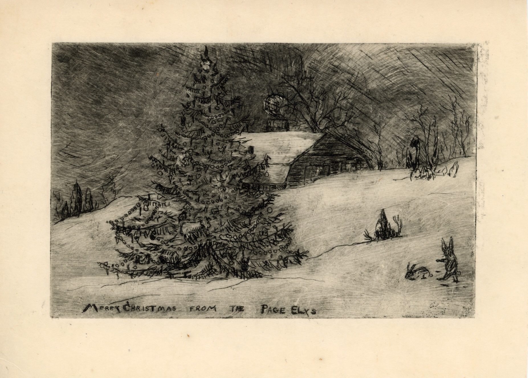 Caro Weir Ely, Merry Christmas from the Page Elys, n.d. Etching. Jack Hoffman Papers, Lyme Historical Society Archives, Florence Griswold Museum