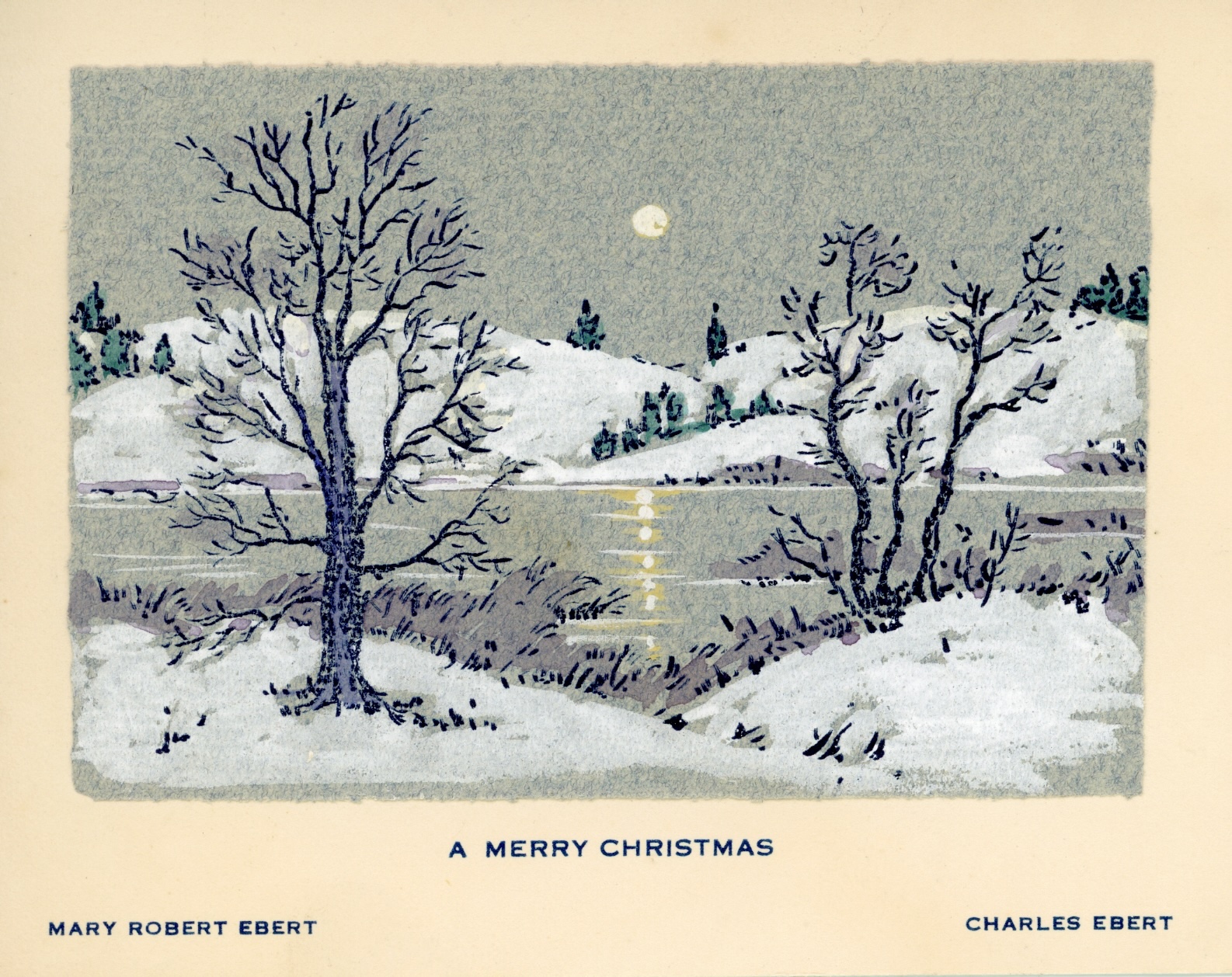 Mary Roberts Ebert, Christmas Greetings, Mr. and Mrs. Charles Ebert. Woodcut. Jack Hoffman Papers, Lyme Historical Society Archives, Florence Griswold Museum