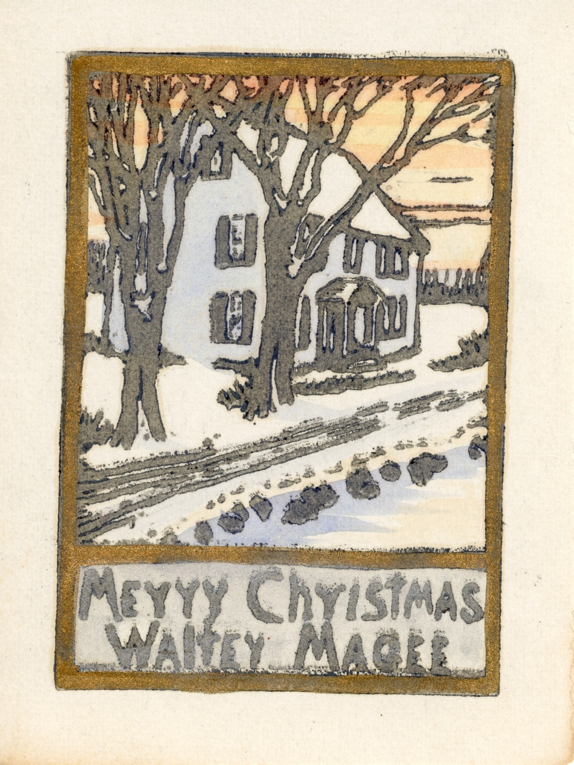 Platt Hubbard, Merry Christmas, Walter Magee, n.d. Linocut with hand tinting. Jack Hoffman Papers, Lyme Historical Society Archives, Florence Griswold Museum
