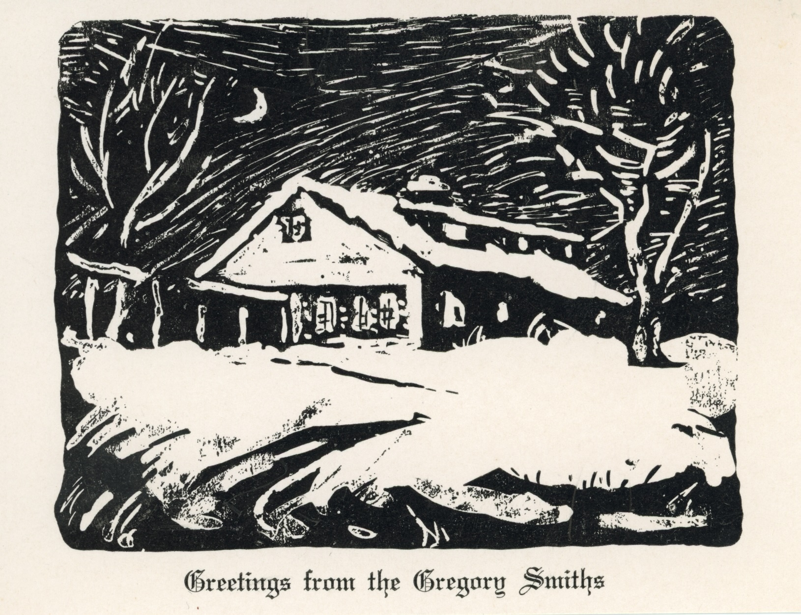 Gregory Smith, Greetings from the Gregory Smiths, n.d. Linocut. Jack Hoffman Papers, Lyme Historical Society Archives, Florence Griswold Museum