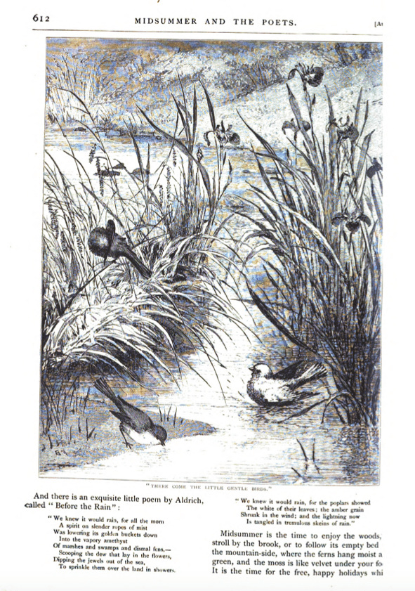 Fidelia Bridges, “There Come the Little Gentle Birds,” St. Nicholas Magazine (August 1876), p. 612