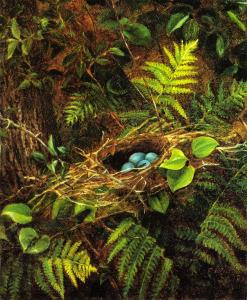 Fidelia Bridges, Still Life with Robin’s Nest, 1863. Oil on wood, private collection