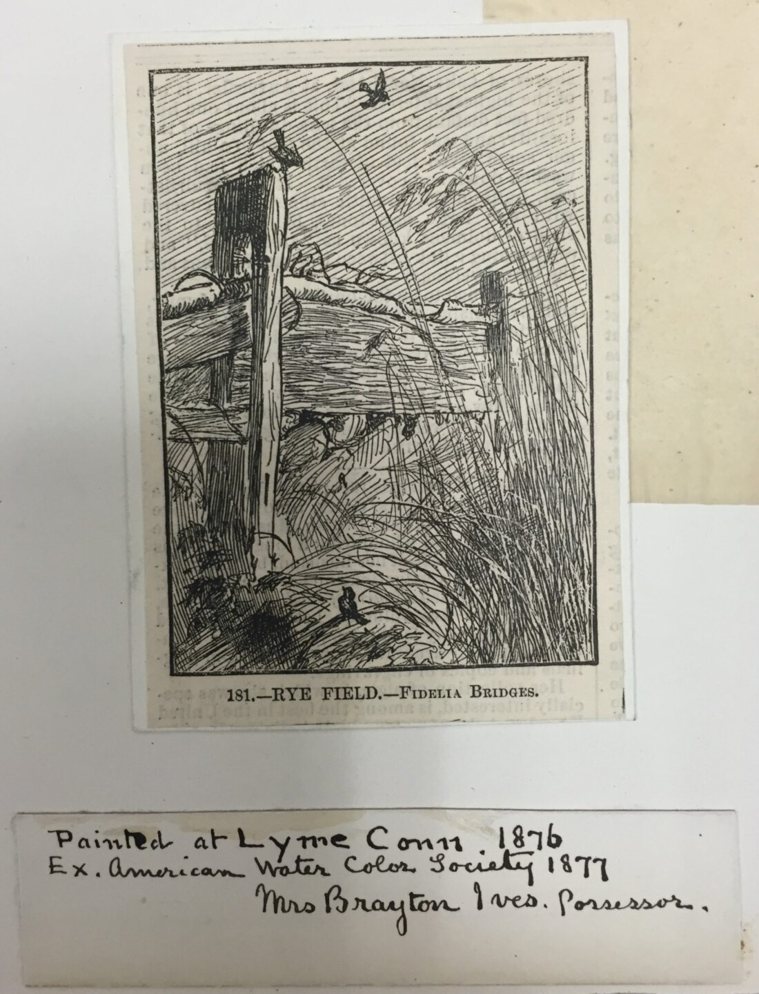 Miss Bridges spent the summer of 1877 in Stratford where Mr. Lay’s mother’s family had a home along the Housatonic River, but the work she submitted to the American Water Color Association’s exhibition that year included at least one work from her Lyme portfolio. Rye Fields, a graceful sketch of grasses and birds beside a rail fence, was “painted at Lyme 1876.” She also identified the Lyme location of two watercolor sketches included in a retrospective exhibition of her work in 1879 at Gustav Reichard’s Art Rooms, a Fifth Avenue gallery. “Sketch. Rogers Lake, Lyme,” which was priced at $25, did not sell, and she shipped “A Mill Pond, Lyme,” priced at $70, to London for an upcoming exhibition at the Dudley Gallery.[17] She spent almost a year in England visiting her younger brother Henry Bridges (1835–1920), then returned to Stratford where Oliver Lay and his family joined her for the summer of 1880. “Miss Fidelia Bridges has been in Stratford some two weeks,” he wrote on July 25. “She boards about a mile away and we see her daily.”[18]