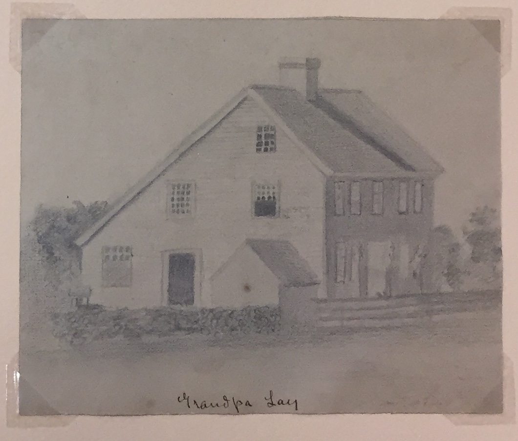 Oliver Lay almost certainly described to Fidelia Bridges the natural beauty and abundant bird life of his family’s Connecticut home. He had mentioned to a cousin in 1871 his own eagerness “to make an album of Lyme sketches—say a picture of the Factory and Hardings house and the brook and the school house with Grassy Hill in the distance and a huckleberry scene with Aunt Lynda & Uncle Prentice [Comstock]… don’t you think they’d be interesting? I’ve had them on my mind for some time.”[8] In 1872 he completed a series of detailed pencil studies of the imposing rock clusters near his Uncle Oliver’s factory as well as the salt box-roofed home of his grandfather David Lay (1769–1843).