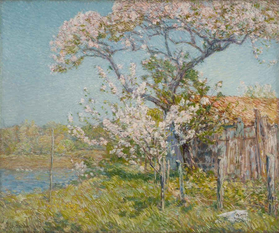 Childe Hassam, Apple Trees in Bloom, Old Lyme, 1904. Oil on wood. Florence Griswold Museum, Gift of the Vincent Dowling Family Foundation in Honor of Director Emeritus Jeffrey Andersen, 2017.16
