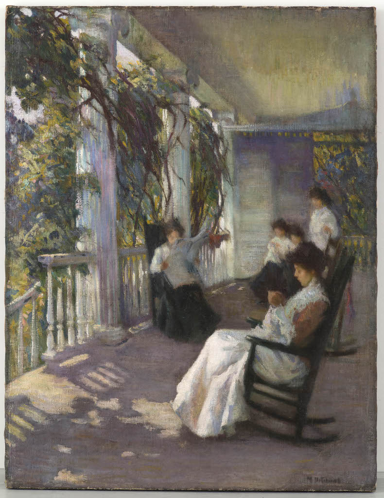 One highlight of the exhibition is Mary Bradish Titcomb’s elegant view of gracefully dressed young women, perhaps summer art students, reading and sewing in the intimate space of the Boxwood Inn’s vine-shaded front porch. Obscuring their faces, Titcomb creates an alluring portrait of gentility and seclusion, but she also shows one woman absorbed in a newspaper, mindful of events beyond the veranda. Traditional gender roles had not yet been challenged in Old Lyme in 1910, and another decade would pass before women gained the right to vote and claimed an expanding role in the public sphere. While most of the leading art colony painters’ wives opposed woman suffrage, a New York portrait artist named Katharine Ludington, raised in her family’s country estate a few doors from Boxwood, led the fight for voting rights in 1919. Connecticut ratified the 19th Amendment the following year.