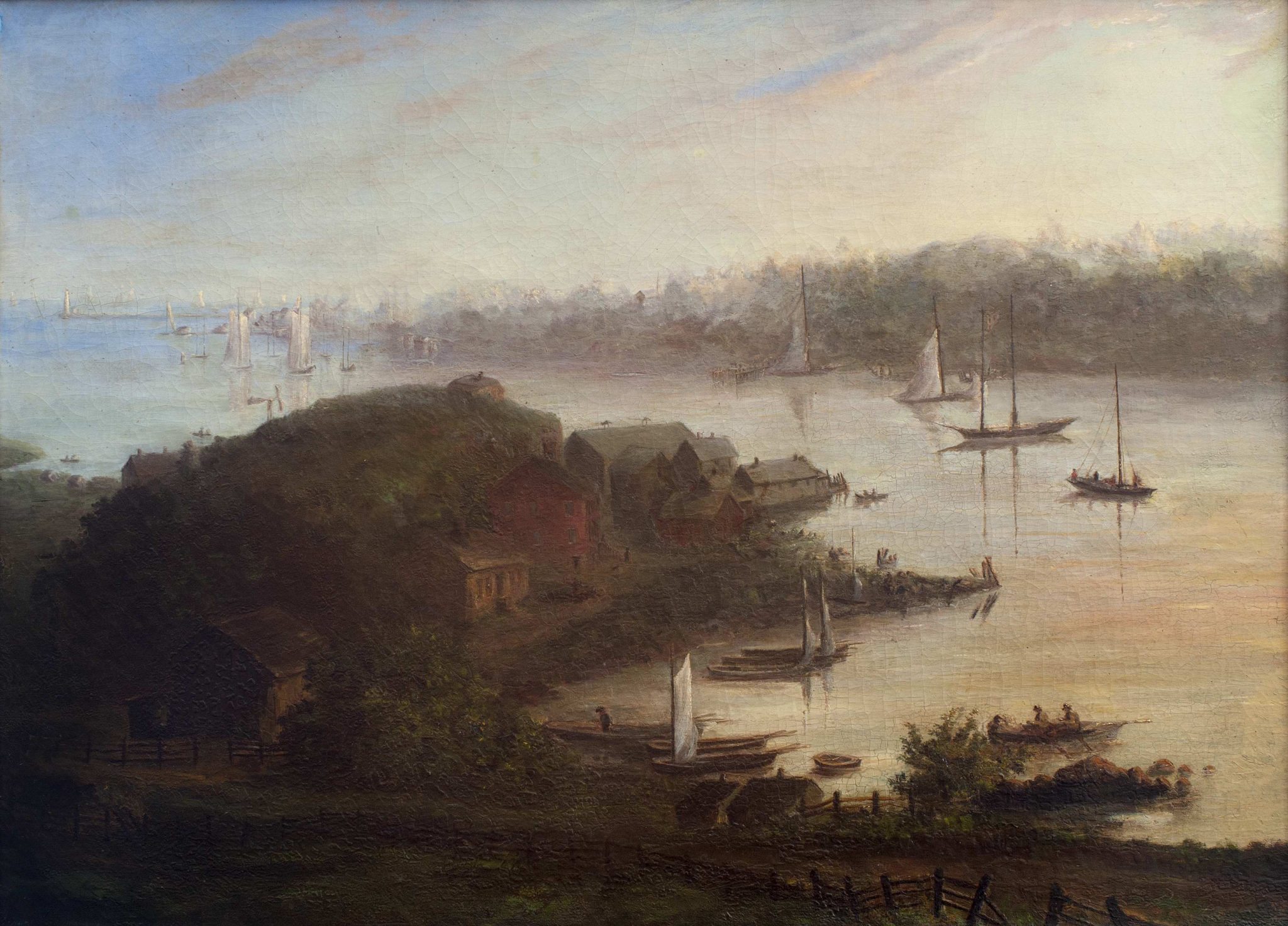 Engaged with the affairs of her family and community, Ellen Noyes Chadwick never pursued painting as a profession, and only three of her works have been identified. View of Ferry Point, her most ambitious painting, preserves on canvas the sweeping backdrop familiar from her childhood. From her dooryard she could see the distant Saybrook lighthouse built when she was a schoolgirl in 1838, as well as the inn, storehouses, and fishing sheds that made the area near the ferry wharf a hub of activity. Her brushwork blurs the opposite Saybrook shoreline, a technique used also in her watercolor study of sailing vessels approaching the river, but she draws the landscape of Ferry Point into sharp focus.