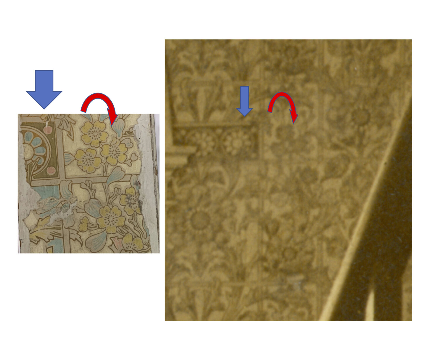Comparison of wallpaper sample and detail of historic photograph of hallway