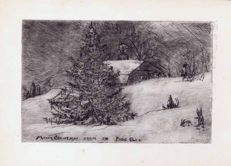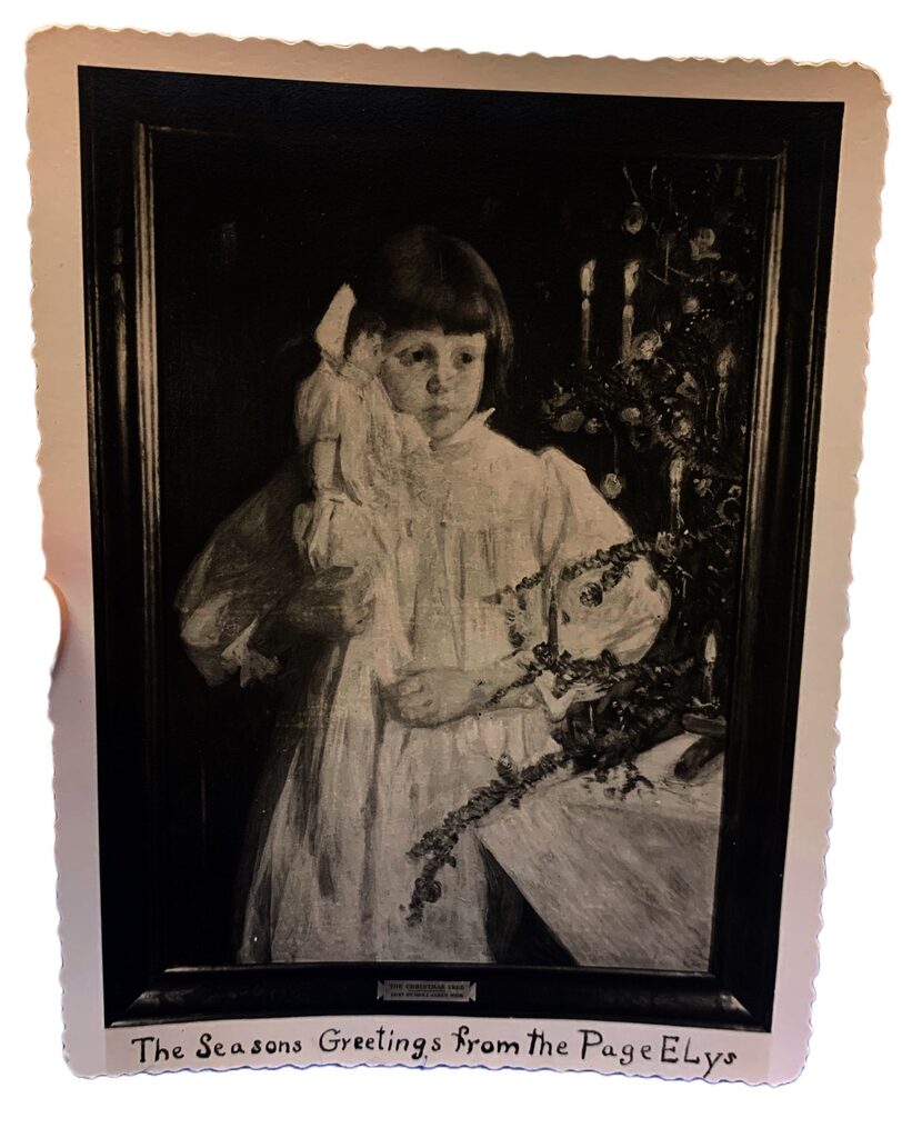 Xmas Greetings from Page–Caro, etchingThe Seasons Greetings from the Page Elys, photographic holiday card reproducing J. Alden Weir’s oil The Christmas Tree, 1890, for which Caro modeled. Original owned by Terra Foundation for American Art