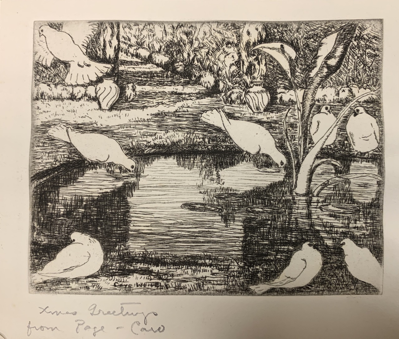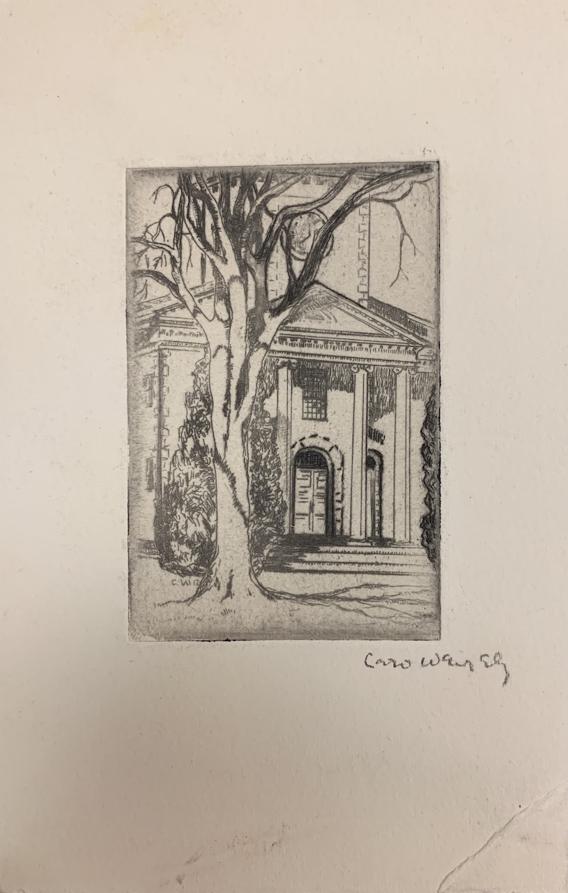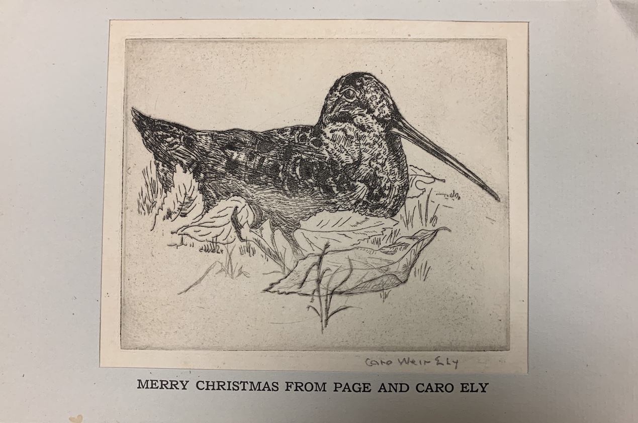 Caro followed in the footsteps of her father, studying in Paris and New York as well as with the artist Joseph Pennell. Caro worked in several media, including paint, pastel, bookbinding, and printmaking. The elder Weir instructed his daughter in etching, and she later printed examples from his plates for a posthumous exhibition as well as making her own works. The holiday cards shown below were created by Caro, who married businessman George Page Ely in 1916. They settled in his hometown of Old Lyme, where she was part of the Old Lyme Craft Guild in the 1930s, a venue for sharing her varied skills.