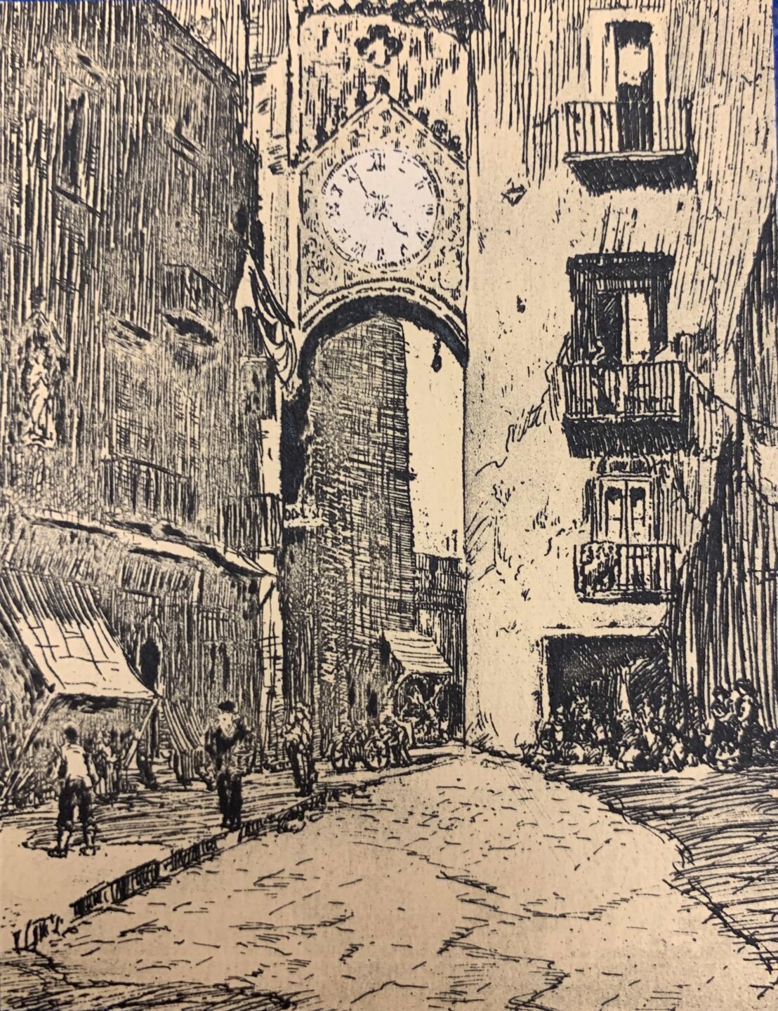 Untitled street scene, inscribed on the back, “Greetings to the Hoffmans from the Page Elys,” ink and watercolor