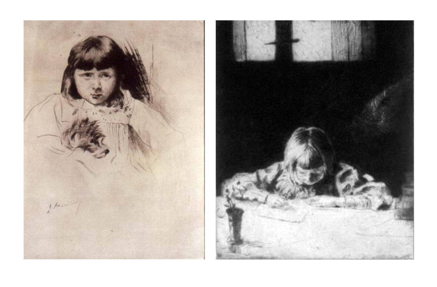 J. Alden Weir prints for which daughter Caro posed: Gyp & the Gypsy, 1890, drypoint, and The Little Student, drypoint. Florence Griswold Museum, Gift of The Hartford Steam Boiler Inspection and Insurance Company