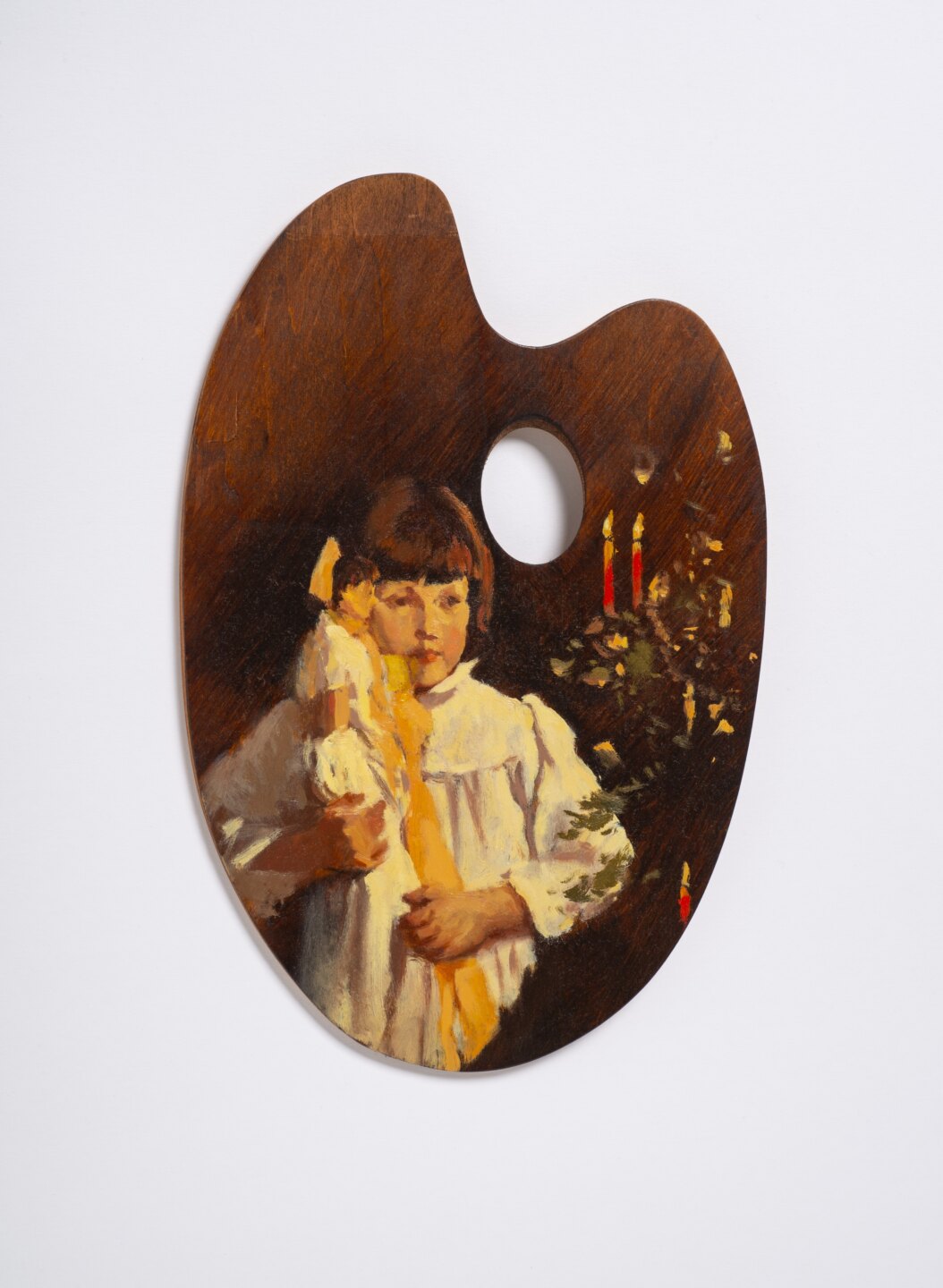 Palette from Miss Florence’s holiday tree inspired by a J. Alden Weir portrait of Caro Weir Ely. Palette by Deane G. Keller, From J. A. Weir’s “The Christmas Tree,” 1890, 2004. Oil on wood palette. Florence Griswold Museum, Gift of Deane G. Keller