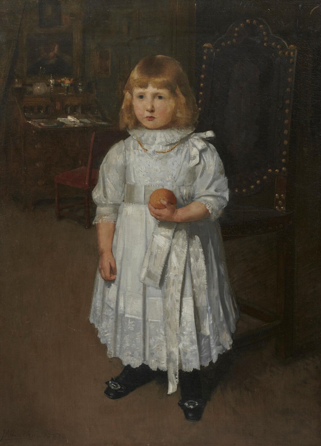 This fall, the Museum acquired a major example of Weir’s portraiture, his 1887 depiction of Caro in her father’s studio at age three, holding an orange. With its scale, emphasis on a full-length figure, and attention to dress, Portrait of Caro demonstrates Weir’s admiration for Old Master portraiture by Frans Hals and Diego Velàzquez. Weir exhibited the regal painting of his daughter at the prestigious 1889 Exposition Universelle in Paris, where it was praised by critics for its distinction.