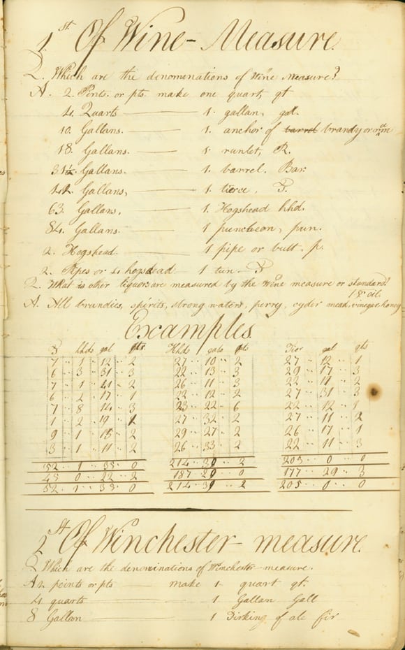 Featured Image: William E. Coult’s Book (n.d.), showing arithmetic lesson on measures of wine. Coult Papers, Lyme Historical Society Archives at the Florence Griswold Museum