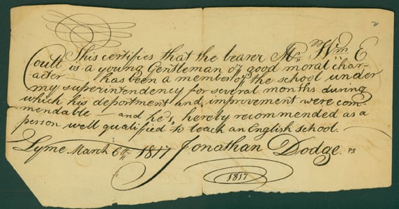 William Coult, certification as teacher (1817). Coult Papers, LHSA at FGM