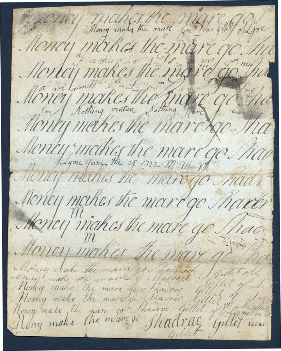 Penmanship practice in the public schools taught the careful formation of letters, but it also provided moral instruction to impressionable students who filled line after line with motivational statements. Half a century earlier Dan Gillet, age 14 and a student at the district school on Grassy Hill, copied two sentences in his notebook on June 25, 1772: “Money makes the mare go” and “Nothing Venture nothing have.” Three years later Dan marched to Boston with other militia members from Lyme, mostly young farm boys who faced seasoned British soldiers laying siege to the city.