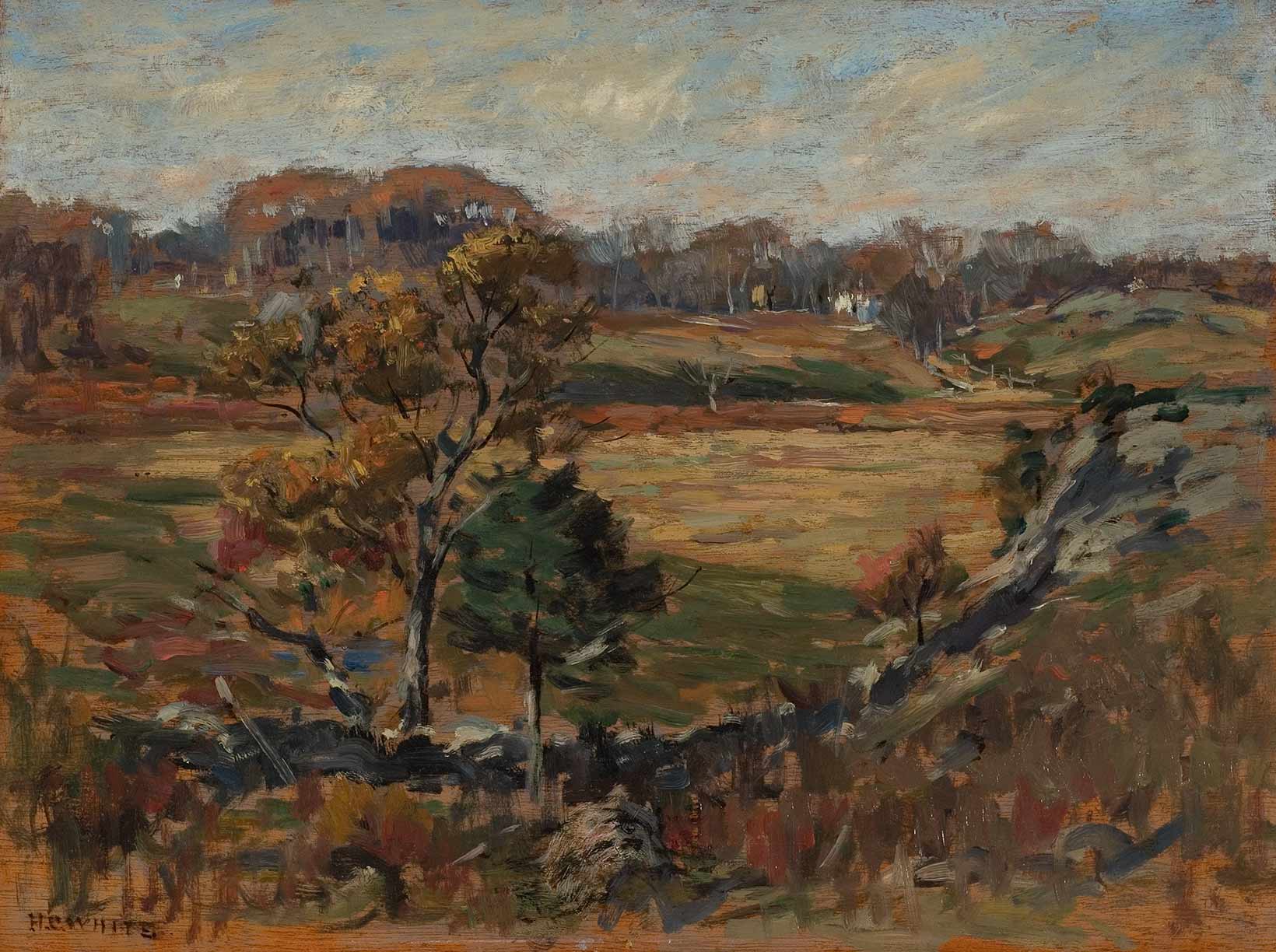 The son of a Hartford Judge, Henry White began his art career when only a teenager taking private lessons with the landscape artist Dwight Tryon. In the mid-1880s, he enrolled in the Art Students League in New York, to continue his studies with Tryon and other professional artists such as Kenyon Cox and George de Forest Brush. Afterward, he married and became the drawing teacher at Hartford High School.
