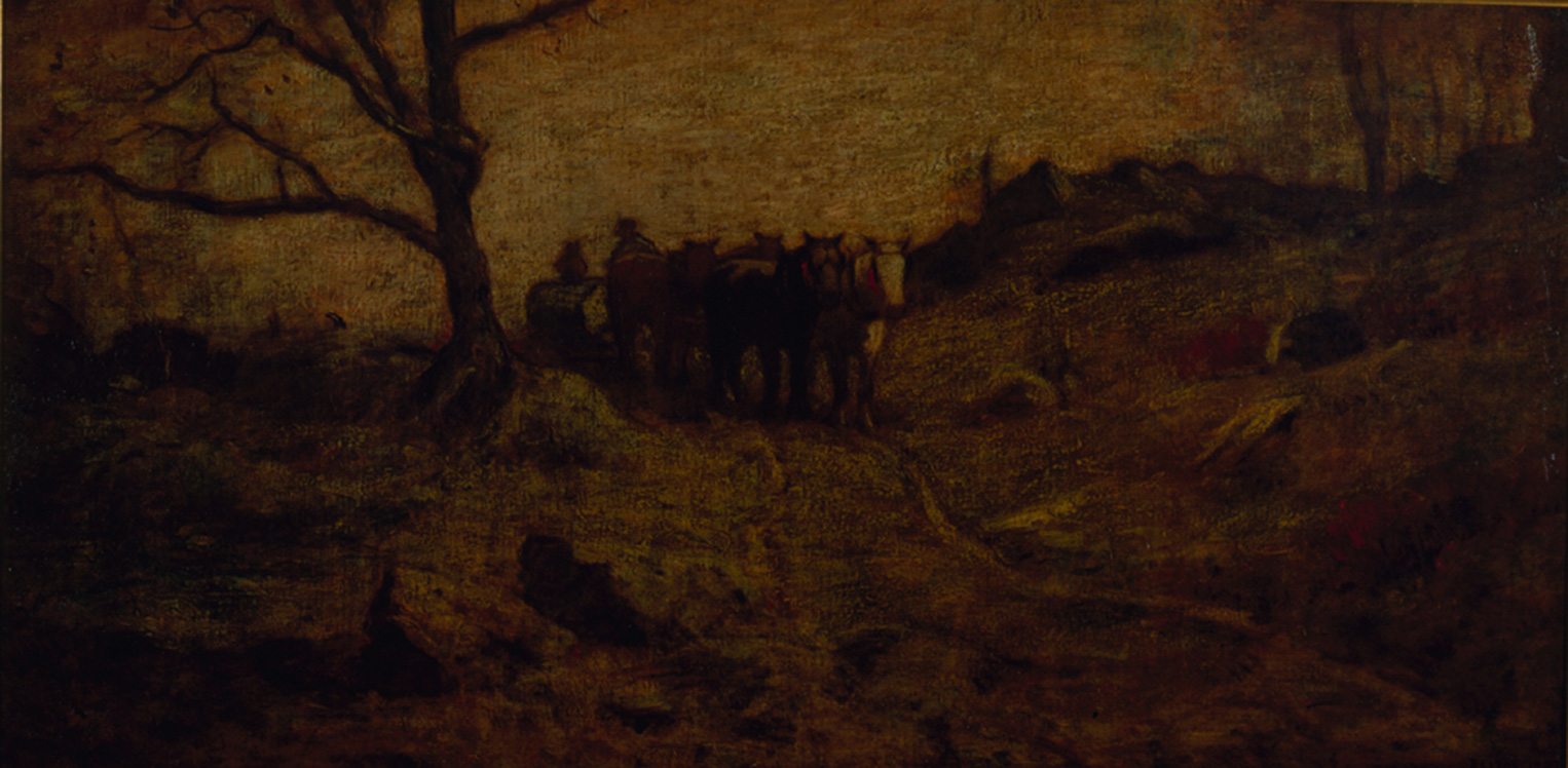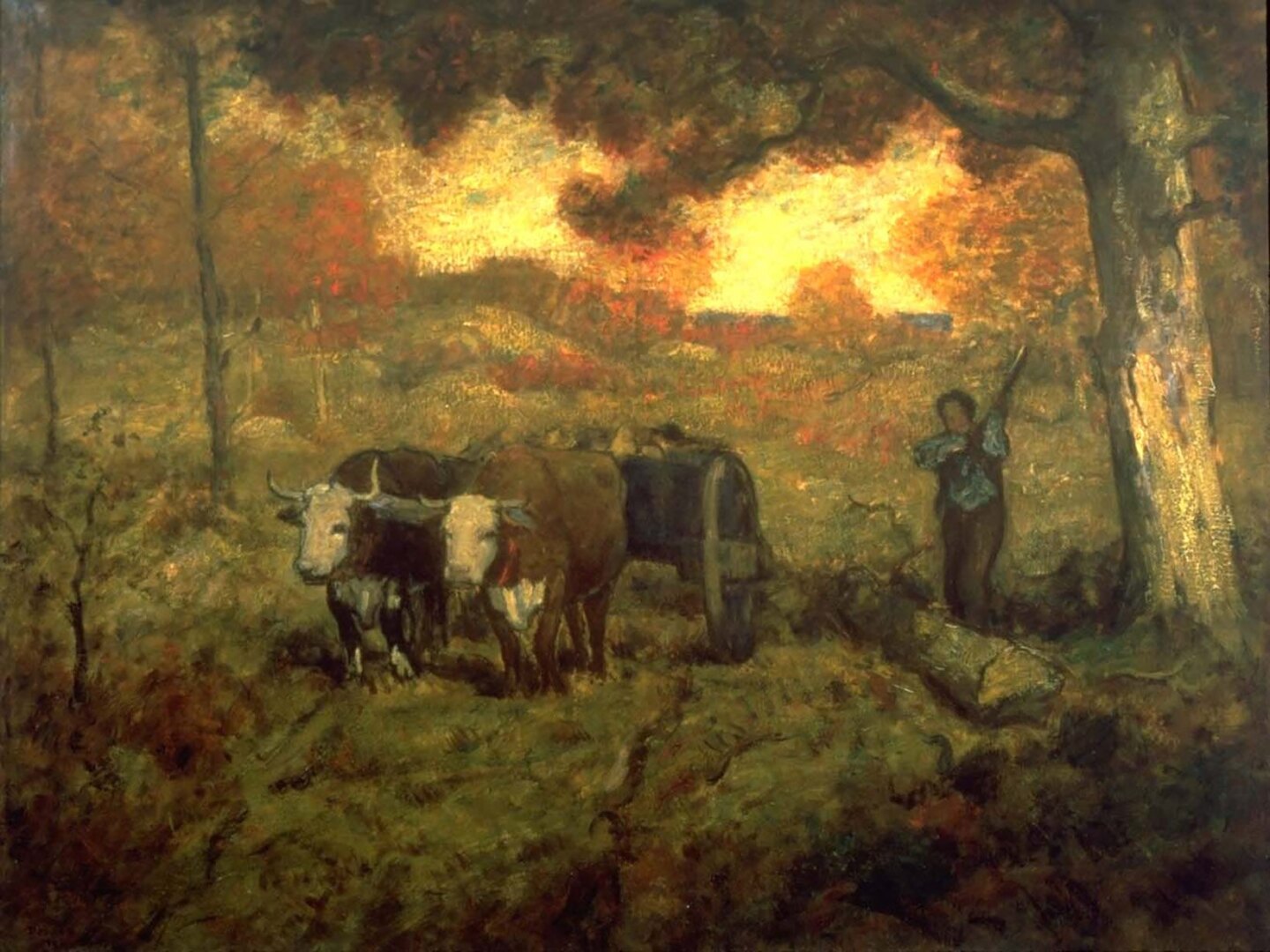 Before moving to Lyme, Dessar painted French fishermen, peasants, and shepherds, often in the golden light of dusk, not unlike the artist Jean François Millet, who made masterpieces from his observations of toiling peasants in and around Barbizon. Dessar was even called the “Millet of America.” Once in Lyme, Dessar continued painting these subjects, replacing the French peasants with New England farmers working alongside their animals. Throughout his career he favored an overall golden tone in his pictures, and would normally paint during the later part of the day. “Nothing pleases [Dessar] more than, when twilight comes on, to stroll through the country roads and lanes and enjoy the restful charm of nature. As he puts it, ‘It is like another world to me – a world of dreams.’ “— Writer Lena M. Cooper, 1899
