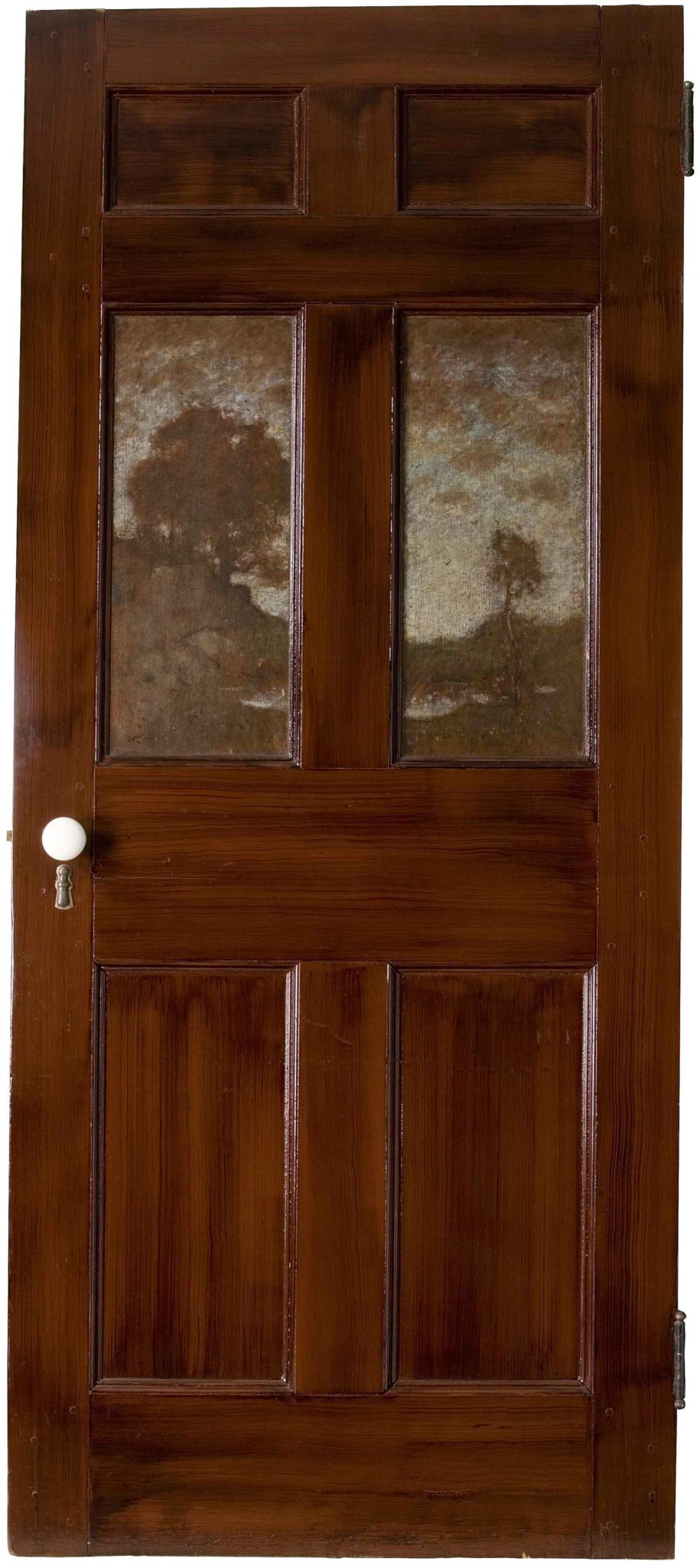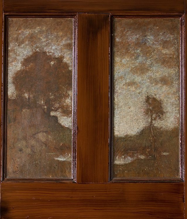 The large tree and the small one are both in the center of their panels, but, when seen in a single picture, one dominates the other. The smaller tree even seems further back. A viewer may indulge in imagining what is “painted” behind the strip of wood that blocks the middle of the view, where, in a more traditional painting, the focal point would be. Is it the pond – or the light in the sky – or something else? In any case, the muted colors, limited to a few and muted with gray, are similar on both panels and help to unify this door painting.