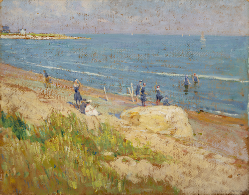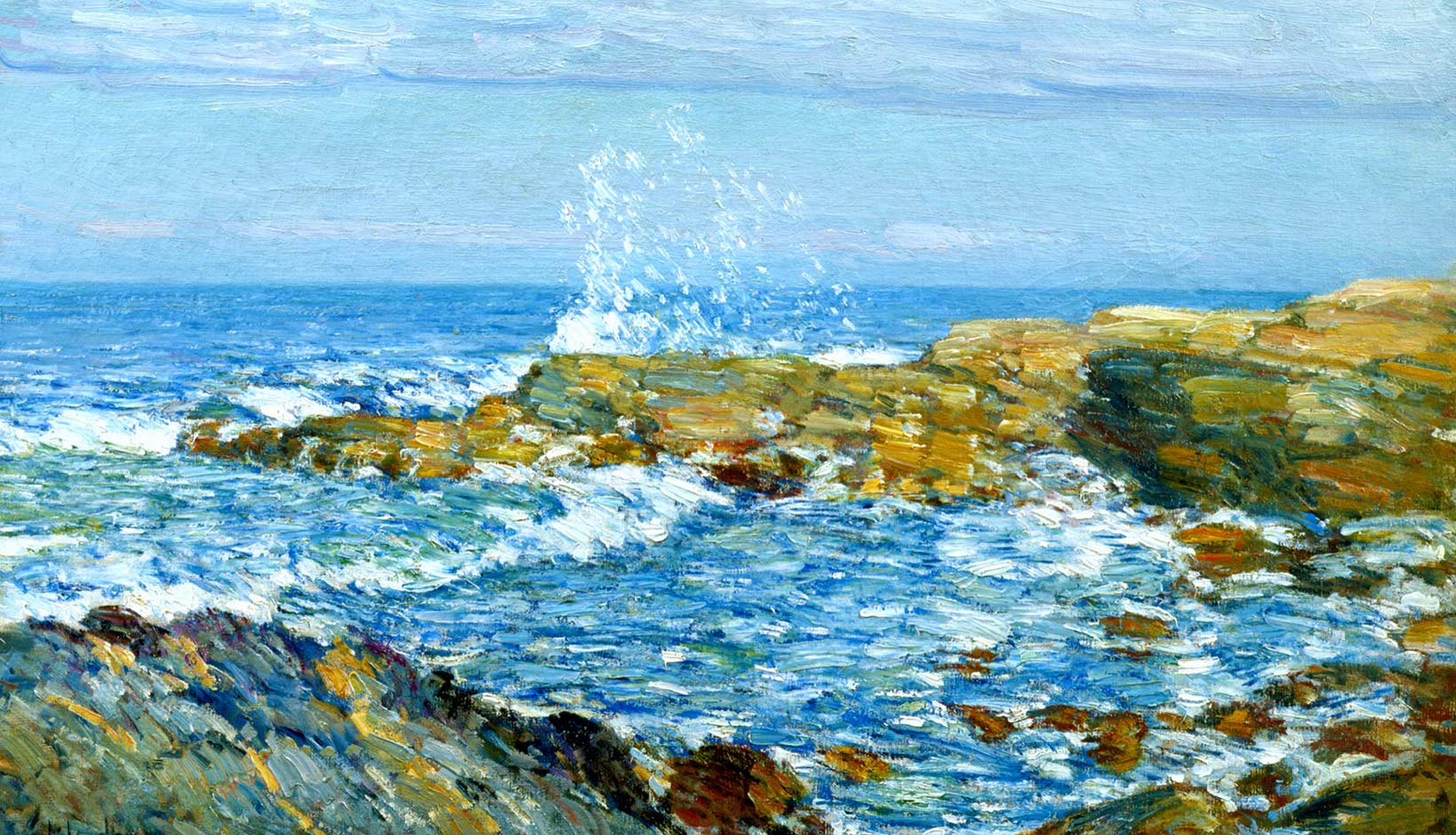 Old Lyme artists ventured to the beach less often than the California Impressionists, but they did paint the coastline on occasion. Two examples include William Chadwick’s beach near Griswold Point and Childe Hassam’s waves crashing on the rocks near the Isle of Shoals off the coast of New Hampshire.