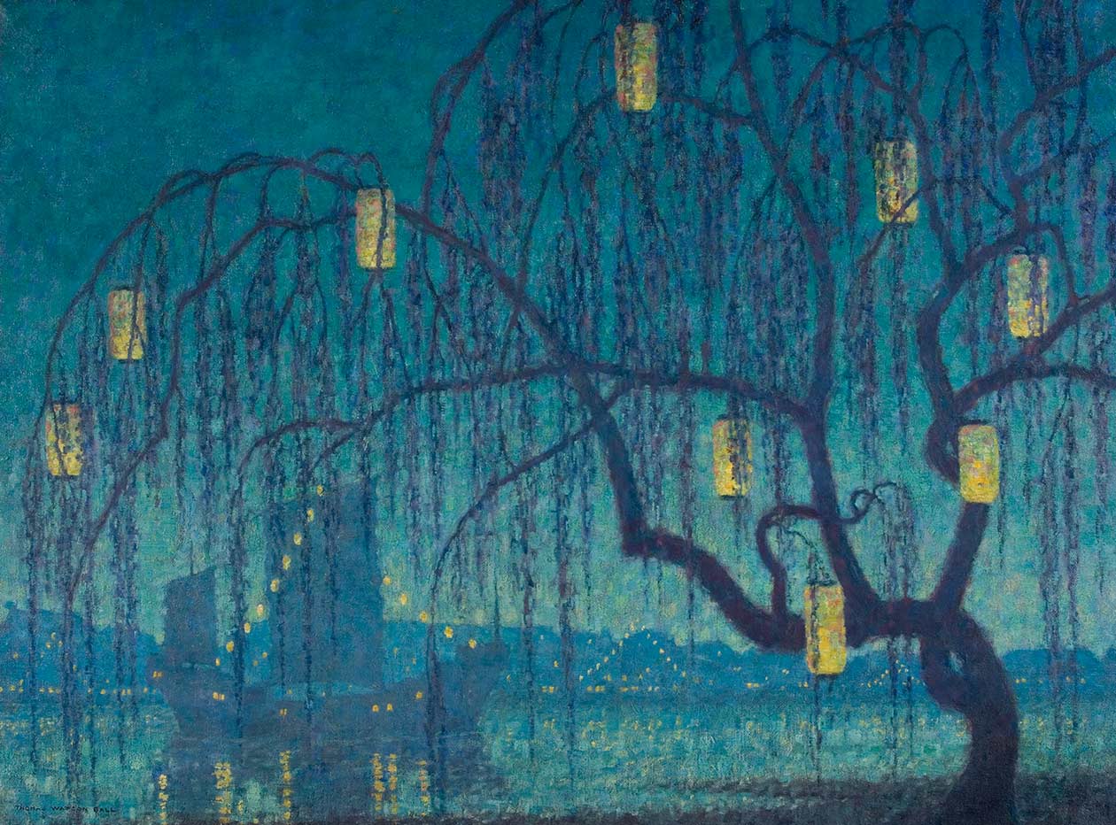 Ball usually referred to himself as a decorative painter. It is not known when he painted this panel. It could have been any time after 1913, when he first came to Old Lyme. He painted some landscapes and marines but is best known for ceiling decorations in New York City churches and for the book covers he designed for Dodd Mead and other major publishing houses. Whether he ever witnessed twilight in a Chinese sea is a question, although he did some traveling, for in 1915 he had a solo exhibition of Puerto Rican landscapes.