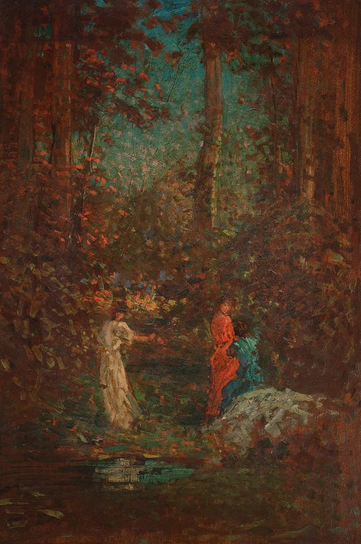 WALTER GRIFFIN (1861–1935), "LADIES IN THE WOODS." OIL ON WOOD PANEL. FLORENCE GRISWOLD MUSEUM, GIFT OF THE ARTIST