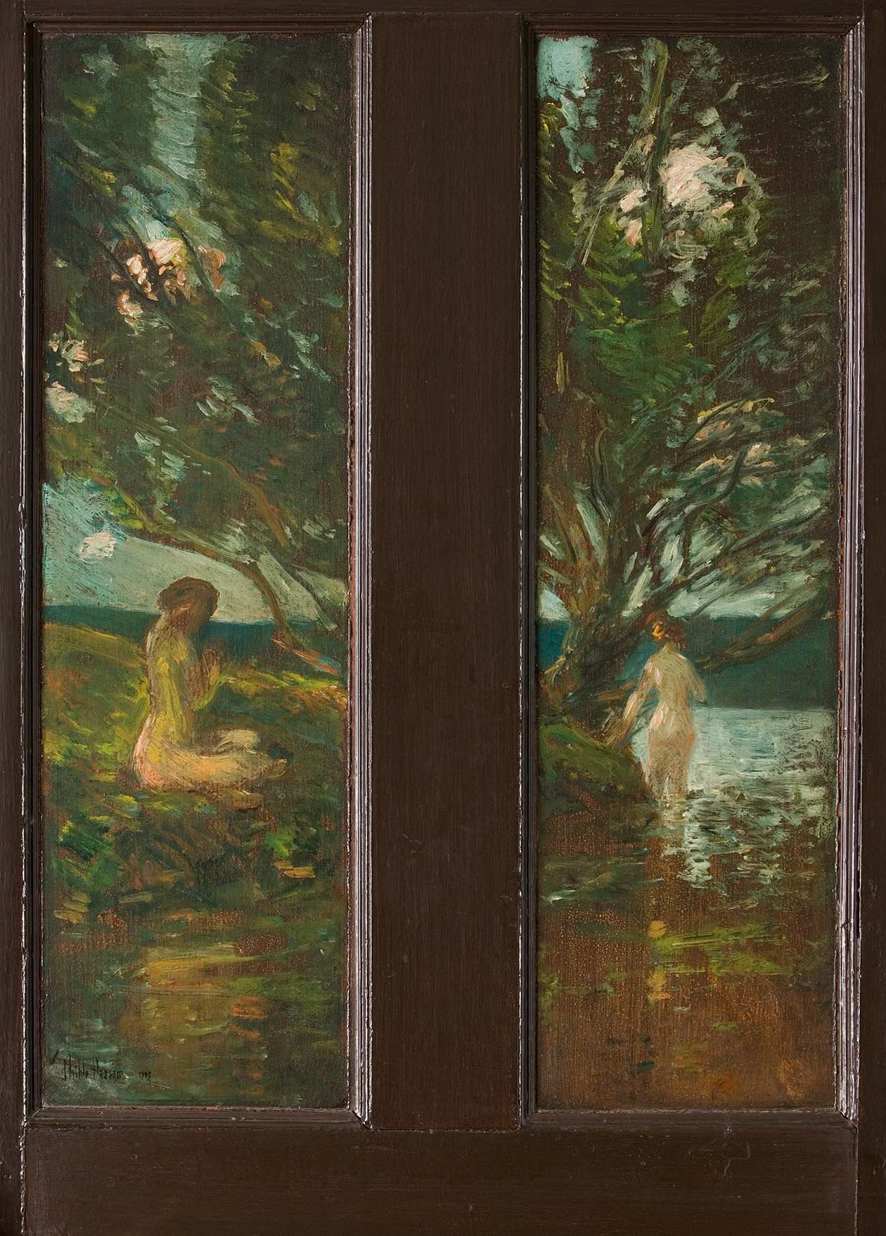 It is difficult to make out their very number, let alone details. Indeed, the white lines that outline and overlay them make these ladies seem ghostly and mysterious – like spirit figures seen only in a dream or in the imagination. Yet they are in a Lyme landscape with Griffin’s trademark shimmering trees. Those slender trees carry one’s eye to the top of the panel but are countered by the strong horizontal of the field of gold that stretches from side to side and by the strange creaminess of the sky. The ladies are pushed close to the picture plane, for their space in the foreground is narrow, bounded by the trees and a stream. Were it not for the rich colors, one might at once think of a Classic marble frieze, where a row of figures is carved in bas-relief. Griffin appears to have combined in this panel his era’s interest in the visual excitement of Impressionism, the calm of Neo-Classicism, and the traditional Western symbolism that connects women with nature.