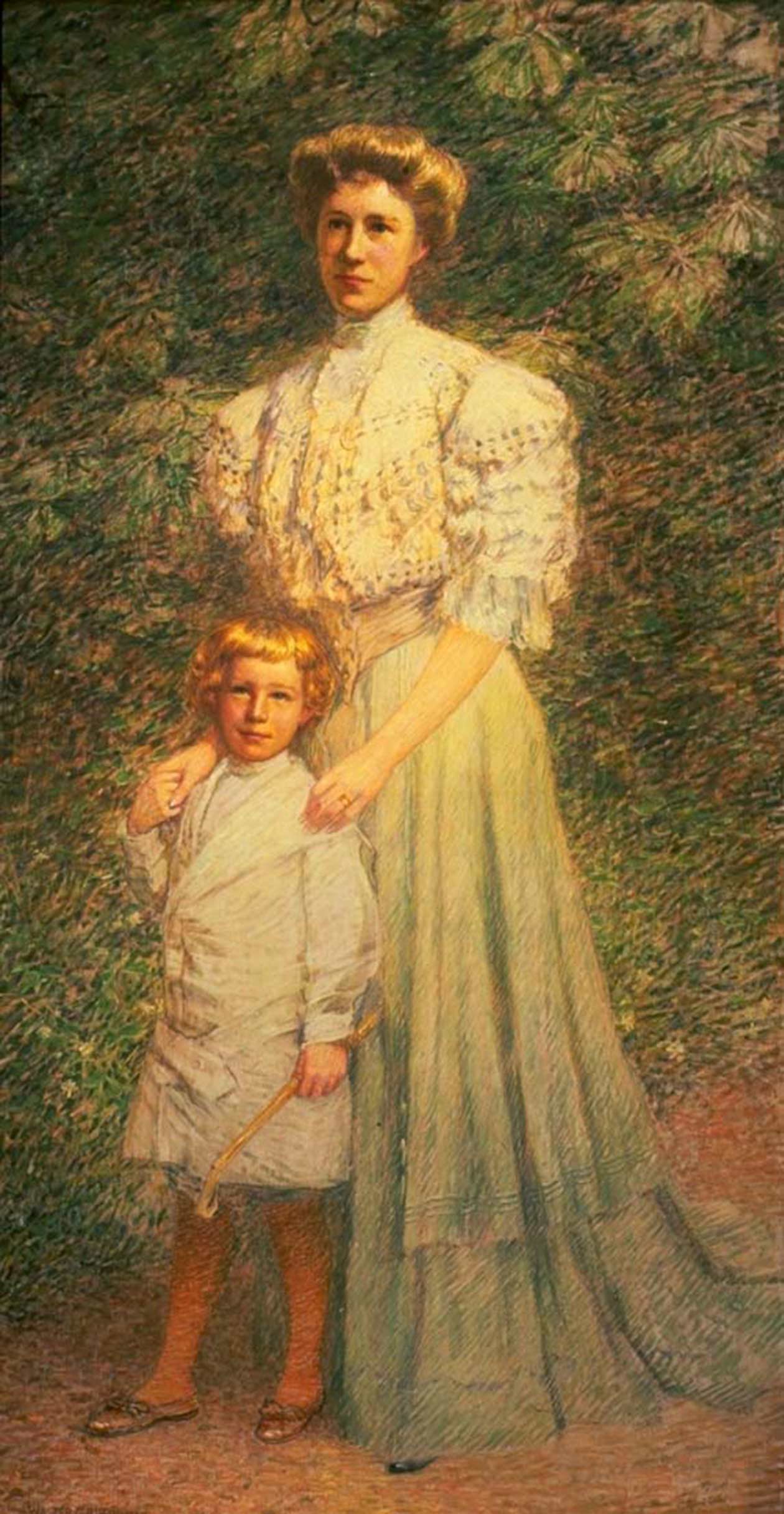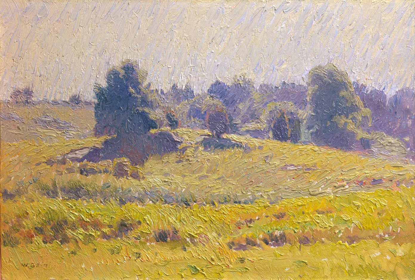 At Old Lyme, Griffin devised his signature painting technique, apparent in this panel, which employs a brush often loaded with two colors at once, not only to apply color but to shape and model forms. His art would change later, in Norway, in France, and in Italy, where he lived on and off for years. He became one of the most highly regarded American artists of his time, and in 1935 the National Academy of Design honored him and his good friend, Childe Hassam, with a joint memorial exhibition. It has been said, however, that Griffin’s arts came alive at Old Lyme.