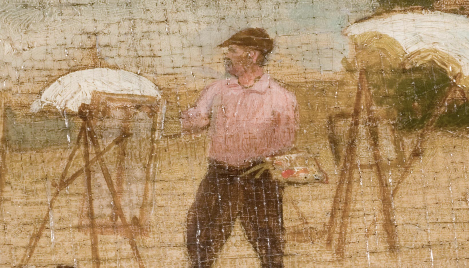 Poor Little Bloticelli (below) portrays Willard Metcalf’s 15-year-old student, Lois Wilcox, who had come to Old Lyme to study with him and with Frank DuMond. Hard at work in her no-nonsense painting outfit, she offers an interesting contrast to the fashionable lady of leisure portrayed by Alonzo Kimball on a panel nearby.