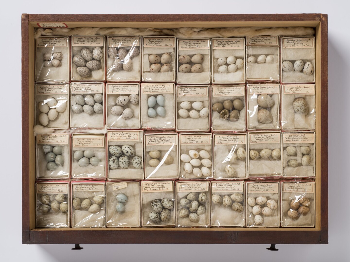 The Museum’s collection of Metcalf’s natural materials are contained in a single cabinet that was donated by his wife in 1971. The tall wooden cabinet has 28 drawers, holding birds’ nests and eggs, and 65 butterflies and moths. Some of the earliest specimens are dated from 1885, when the artist was in France. A number of eggs were collected in the village of Giverny, where the Impressionist artist Claude Monet lived and worked. Although the two artists did not become friends, Metcalf did tutor Monet’s son and stepson in botany and ornithology.