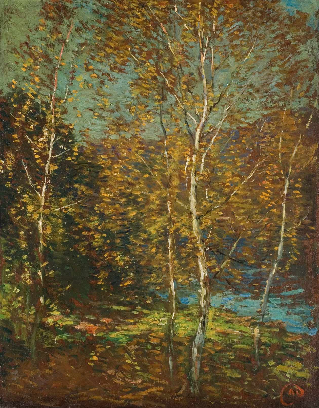 Birch Trees Beside a Lake (below) is thickly painted, strongly colored, and mostly made up of very short brushstrokes. The effect is a slight twittering of stiff autumn leaves, and there is more movement in the painting besides. The white slender birch trees insistently lead one’s eye from bottom to top. Broad bands of land, trees, and sky counteract that vertical thrust with a strong horizontality, and the stippling that represents leaves moves the eye all around. For this and one other panel, Metcalf chose to use his monogram signature which is a red M in a circle seemingly done with one continuous movement.