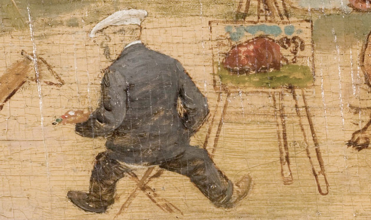 Howe was not merely one of the artists to appear in The Fox Chase, but also somewhat of an uninvited collaborator. After Howe’s dog Weeksie (also on the panel) died, Howe asked Poore to paint a rock over him, claiming the image of the dog made him too sad to eat. He also scratched out the face of fellow artist George H. Bogert with a penknife after learning he allegedly did not pay his board bill. Fortunately for Bogert, the original artist Henry Rankin Poore painted his face back in years later.