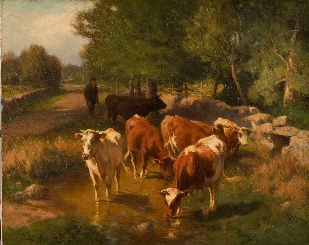 According to his biographer at the famed Salmagundi Club in New York, “His paintings were honest transcripts from nature, faithfully cooked up from many studies and sketches from objective observations, however he knew his cattle so well that France decorated him with the [Cross of the] Legion of Honor.” Nevertheless, as the 20th century pressed on, he sold less and less. In a letter to Florence Griswold in 1918 he laments, “I am blue as indigo. Have done nothing in the way of sales this winter and have no prospects.”