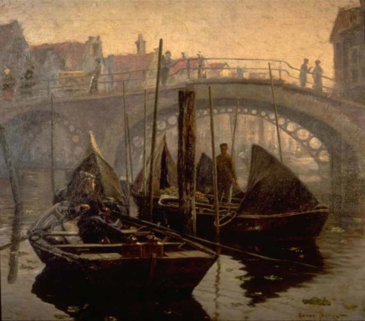 After painting the majestic bull on a door in Florence Griswold’s parlor in 1901, Howe moved to the back of the house and at some point painted the door leading into the dining room. Perhaps because Matilda Browne had already portrayed two calves on a door nearby, Howe chose a scene like those he had witnessed in the 1880s in the Dutch village of Scheveningen on the North Sea (above), where the fishing fleet employed unusual flat-bottomed boats known as bomschuiten, which were dragged onto the beach to dock.